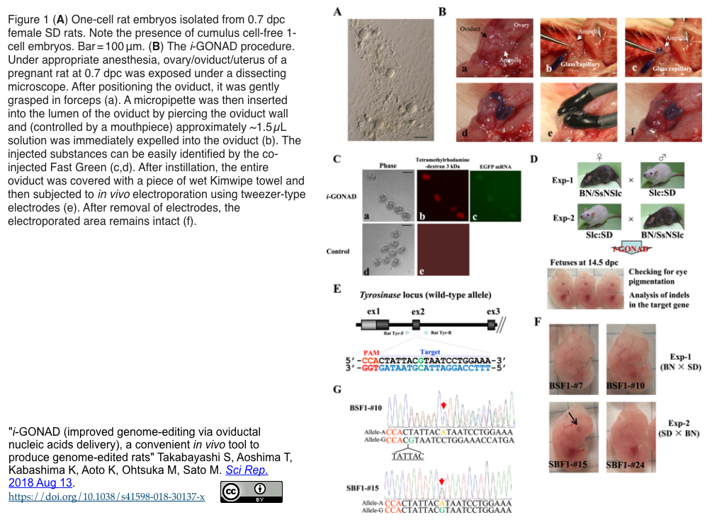 - [出典]"i-GONAD (improved genome-editing via oviductal nucleic acids delivery), a convenient in vivo tool to produce genome-edited rats" Takabayashi S, Aoshima T, Kabashima K, Aoto K, Ohtsuka M, Sato M. Sci Rep. 2018 Aug 13.