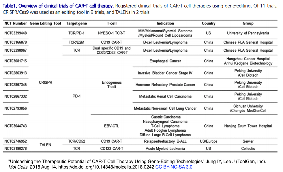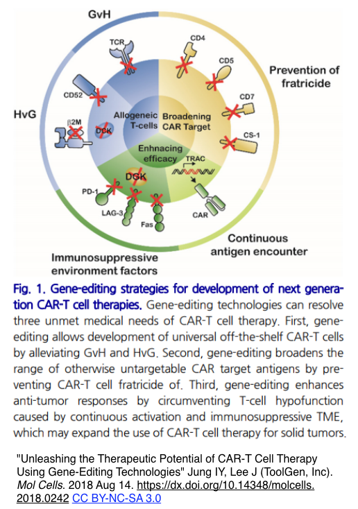 [出典]"Unleashing the Therapeutic Potential of CAR-T Cell Therapy Using Gene-Editing Technologies" Jung IY, Lee J. Mol Cells. 2018 Aug 14.