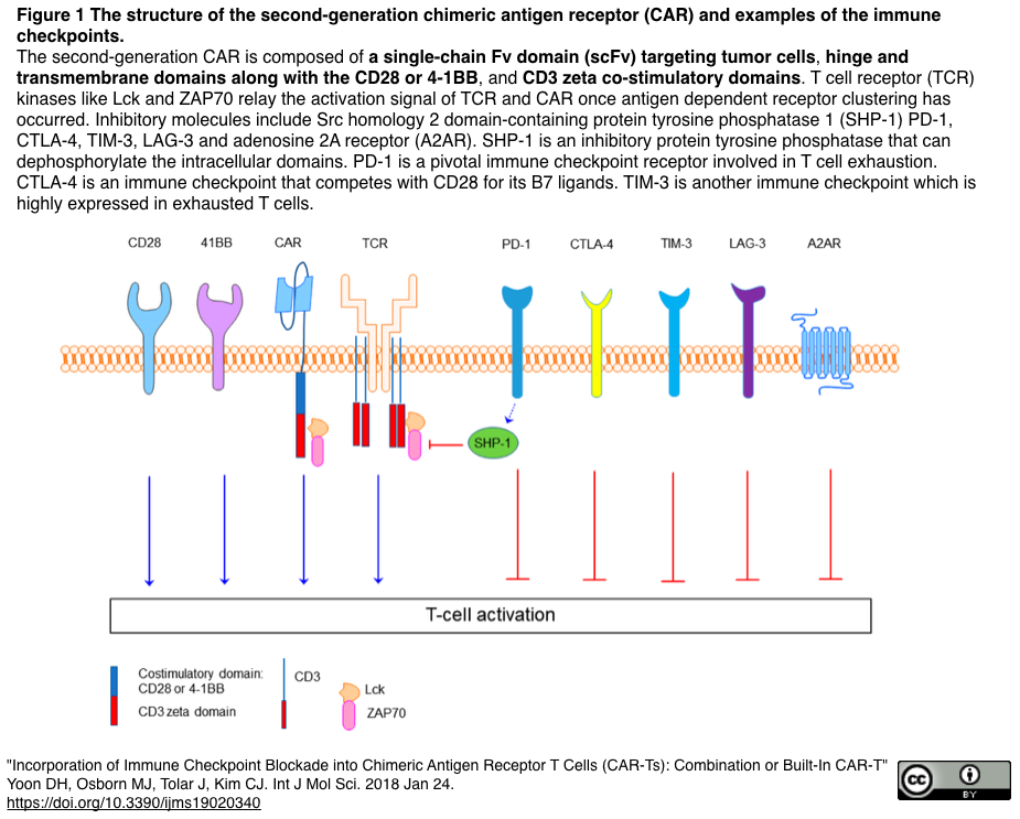 - Int J Mol Sci (2018)掲載レビューから引用したCAR-T第2世代の模式図(左下図参照);第1世代CARは,腫瘍抗原に結合するモノクローナル抗体可変領域の軽鎖と重鎖を直列に結合させたsingle-chain Fvドメイン(scFv、左下図のCARにある水色部分)と、シグナルをT細胞内へ伝達するCD3 ζドメイン(赤色の棒)で構成;第2世代CARは、scFVとζドメインの間に共刺激分子(CD28または4-1BB、青色の棒)を挿入;CD28と4-1BB双方を挿入したCARは第3世代CARと呼ばれる。
