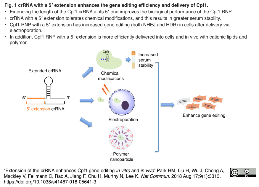 - [出典]"Extension of the crRNA enhances Cpf1 gene editing in vitro and in vivo" Park HM, Liu H, Wu J, Chong A, Mackley V, Fellmann C, Rao A, Jiang F, Chu H, Murthy N, Lee K. Nat Commun. 2018 Aug 17;9(1):3313.