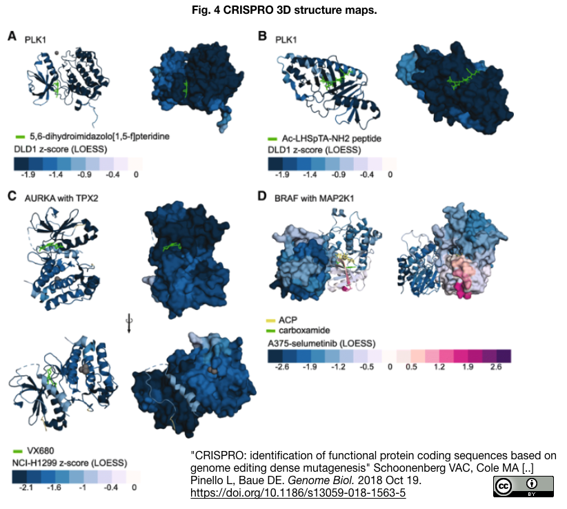 - CRISPROは、CRISPRスクリーンからのNGSデータを入力とし、各gRNAの機能スコアをゲノム、トランスクリプトおよびタンパク質3次元構造へ割り付け、可視化する(パイプラインについて原論文 Fig.1引用左下図参照;可視化について原論文 Fig.4引用右下図参照)また、CRISPROの特徴に基づいた機械学習によって、gRNAの効率予測も可能になった。