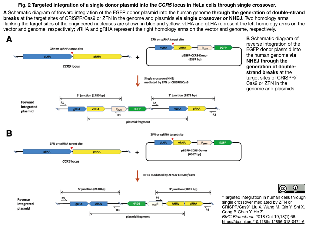 [出典] "Targeted integration in human cells through single crossover mediated by ZFN or CRISPR/Cas9" Liu X, Wang M, Qin Y, Shi X, Cong P, Chen Y, He Z. BMC Biotechnol. 2018 Oct 19;18(1):66.