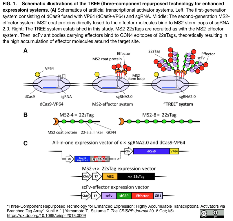 [出典] "Three-Component Repurposed Technology for Enhanced Expression: Highly Accumulable Transcriptional Activators via Branched Tag Array" Kunii A [..] Yamamoto T, Sakuma T. The CRISPR Journal 2018 Oct;1(5)