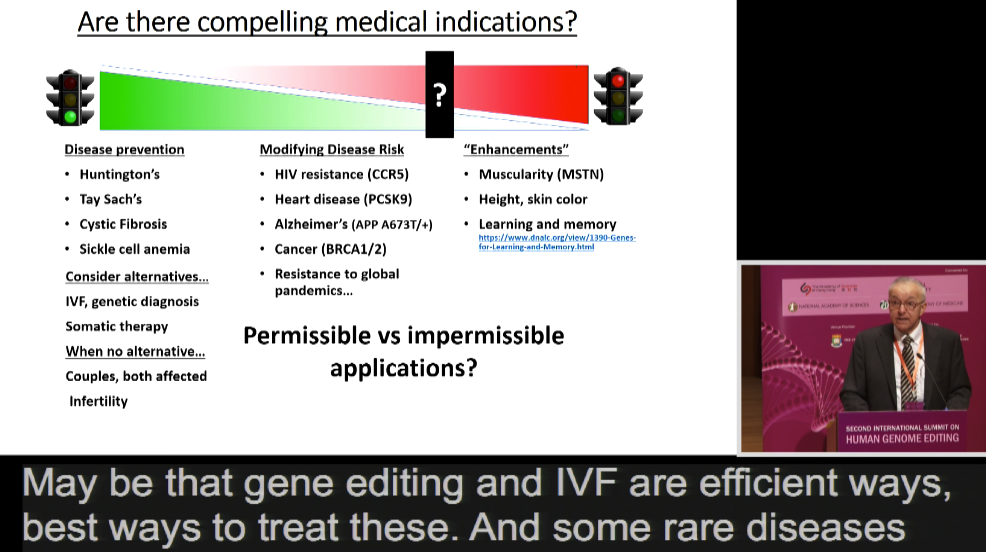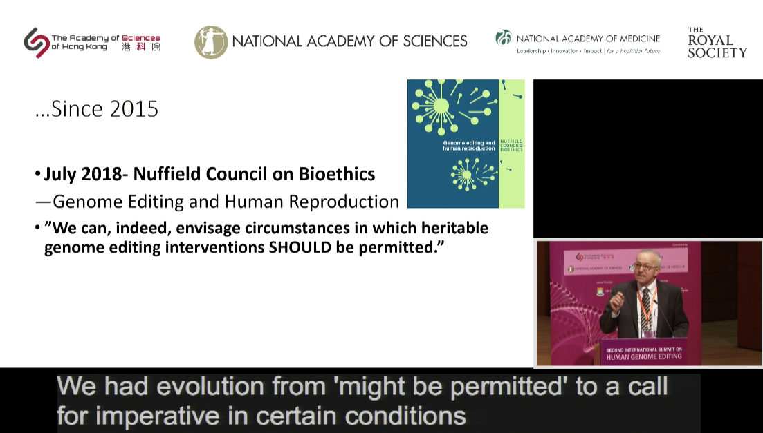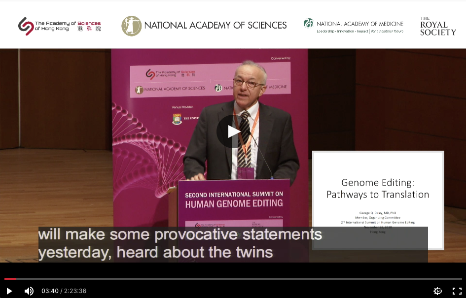- Harvard Medical SchoolのGeorege Daleyは、香港で開催されたヒトゲノム編集国際サミットで、Jiankui Heに先立ち「Genome Editing: Pathways to Translation」と題する講演で「Jiankui Heの"misstep"に怯まず、その遺伝子編集が次世代に継承される精子、受精卵あるいは胚のゲノム編集の臨床応用へのパスを追求すべき (Some steps are mis-steps, should start thinking about plausible and responsible ways of using tech..)」というメッセージを発した(Web cast ビデオ 1m22secから);以下の図3つは、講演冒頭、終盤2箇所からの画面キャプチャ