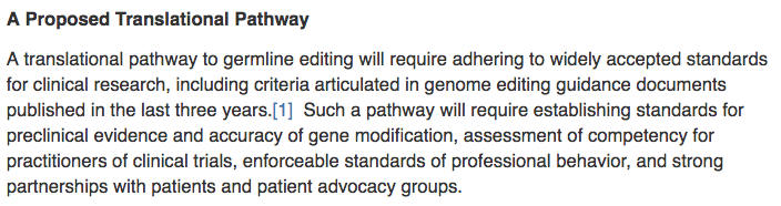 - サミット組織委員会は、その声明に"A Proposed Translation Pathway" (上図右参照)という項を設け、Organizers of gene-editing meeting blast Chinese study but call for ‘pathway’ to human trials (Science 2018-11-29 6:15 AM)をというメッセージを発した。