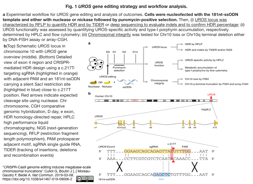 - Cas9nと181nt-ssODN-c.217 CのテンプレートによりHEK293T細胞株からCEPのモデル細胞c.217C HEK293を作出し、この遺伝子変異を、Cas9nと181nt-ssODN-c.217 Tのテンプレートに基づくHDRを介して修復し、酵素UROSの活性が~30%まで回復し、Type-I ポルフィリン蓄積も解消した。HDR効率は5.8%であり、indelsは見られなかった。ただし、10q腕の末端欠失が稀ではあるが発生した。