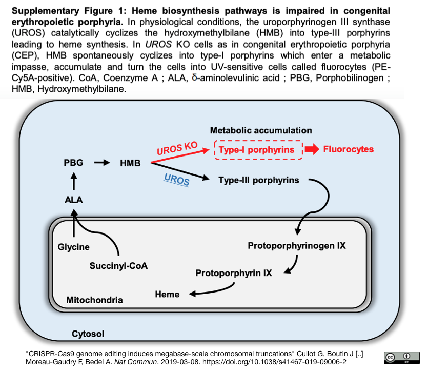 - HEK293T細胞において、オンターゲットでは、アレルの~21%でHDRが実現した。一方で、アレルの~60%にはNHEJを介したindelsが誘導された。このオンターゲットindelsは、UROSのノックアウトを介して、ヘム生合成パスウエイにおいてType-I ポルフィリン蓄積を誘導することを見出した(原論文 Supplementary Figure 1引用下図参照)。