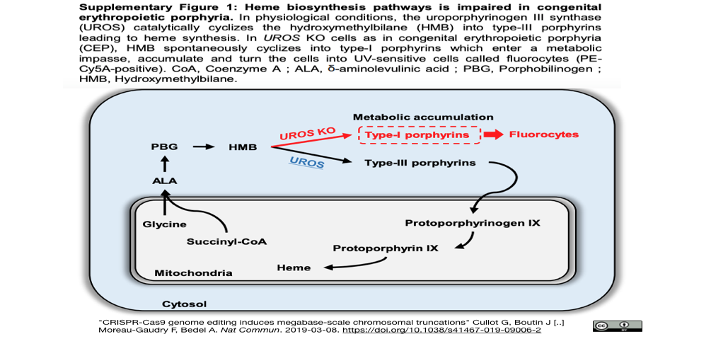 - Université de Bordeauxなどフランスの研究グループは、先天性骨髄性ポルフィリン症 (congenital erythropoietic porphyria, CEP)のモデル作出と治療を目的として、ヘム代謝に関わる酵素ウロポルフィリノーゲンIIIシンターゼをコードするUROS遺伝子の編集を試みた。