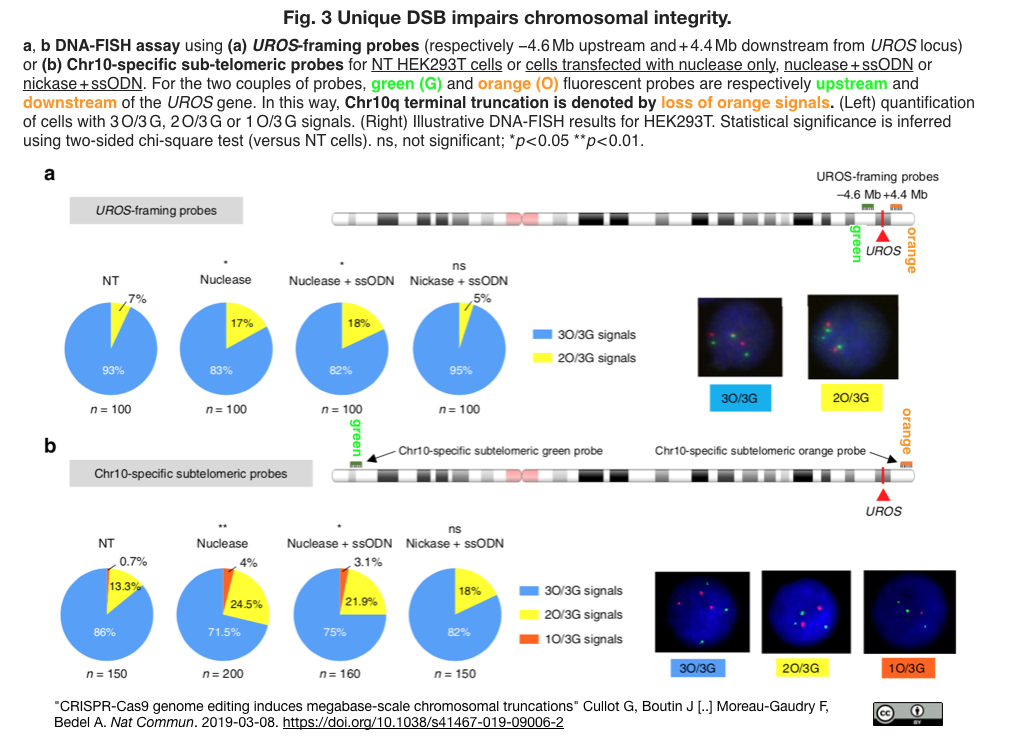 3本のChr10が存在する割合が63%のHEK293T細胞 (25%が4本; 6%が2本)において、Cas9、Cas9とssODNおよびCas9nとssODNによる編集結果を比較した。サブテロメアの両端を標識して得られたデータ (上図b参照)から、Cas9を使用した場合にHEK293T細胞の10%に、UROSの下流に7.5 Mbの欠失が誘導され、Chr10qが短縮されたことを見出した。さらに、Cas9で編集した10クローンを詳細に解析したところ、3クローンで欠失が発生し、その2クローンについて、UROS DSBサイトから10q染色体テロメア近傍まで欠失していることを見出した。一方で、UROSの上流に31 Mbの重複が発生したクローンも見出した。 - 単一DSBに起因する染色体短縮は、K-562細胞株でも確認された。HEK293T細胞もK562細胞も複雑で不安定な核型で、p53活性を欠いている。そこで、ヒト包皮初代線維芽細胞 (hFF)そのhTERT不死化細胞対象に実験を繰り返し、染色体短縮はFISHの検出限界以下であったが、TP53遺伝子ノックアウトにより染色体短縮のリスクが10倍になることを見出した。先行研究で「p53を阻害するとCRISPR/Cas9のHDR効率が著しく向上する」とされたが、p53阻害は染色体短縮の副作用を伴うことになる。