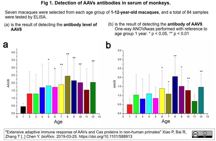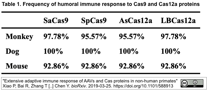 [出典] "Extensive adaptive immune response of AAVs and Cas proteins in non-human primates" Xiao P, Bai R, Zhang T [..] Chen Y. bioRxiv. 2019-03-25.