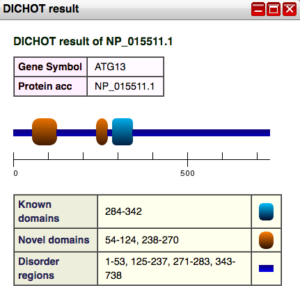 - [注] 参考図は、情報拠点Autophagy DBをAtg13で検索・表示させたDICHOTプログラムによるIDRとドメインの予測図