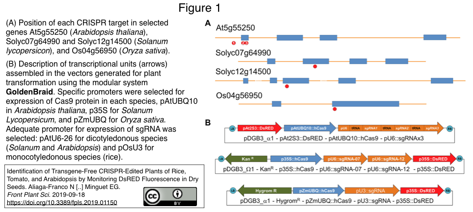21. Identification of Transgene-Free CRISPR-Edited Plants of Rice, Tomato, and Arabidopsis by Monitoring DsRED Fluorescence in Dry Seeds. Aliaga-Franco N [..] Minguet EG. Front Plant Sci. 2019-09-18. (bioRxiv 2019-02-19)