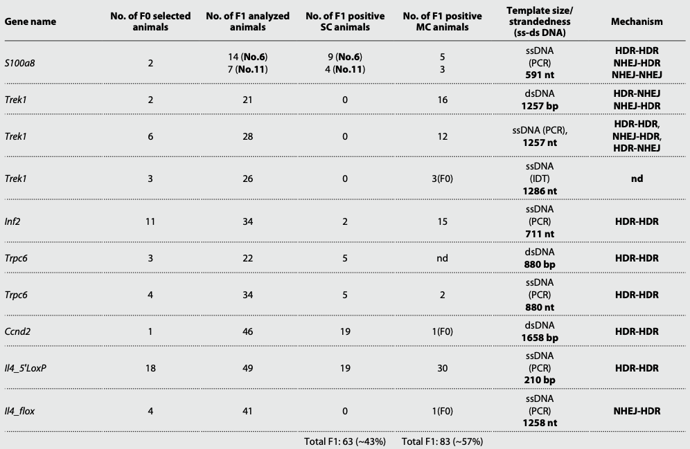 - また、Table 1引用右上図に、モデルとした6種類の遺伝子を標的とし、ドナーをssDNAまたはdsDNAとその長さを変えた10件のターゲッティングの実験にて、F1世代でのSCのマウスと、最大3コピーまでのマルチコピー (MC)のノックインが発生した例数とその機構がまとめられている。F1世代の解析から、Cas9-crRNAをマイクロインジェクションした受精卵母細胞由来のF0世代でモザイクが発生していたことが示唆された。