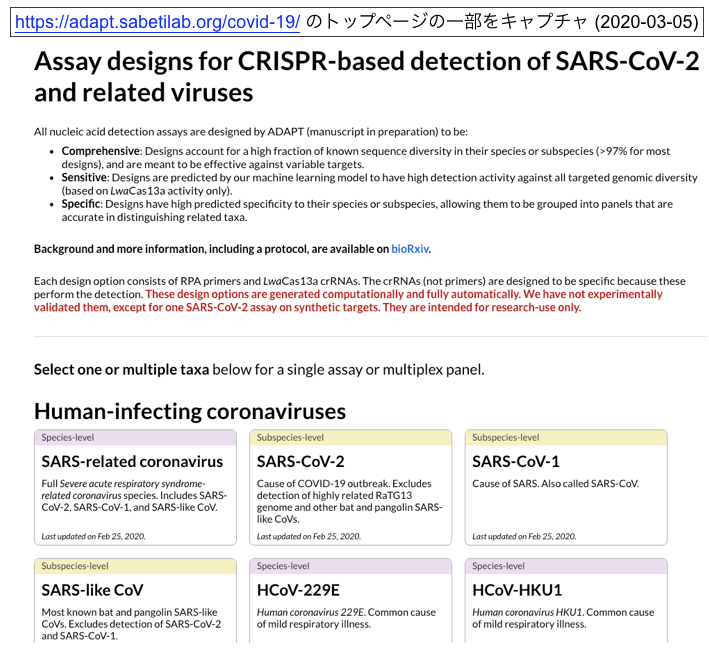 - Broad Instituteの研究グループは、SHERLOCKによる核酸検出アッセイの迅速な設計 (RPAプライマーとLwaCas13a crRNAsの設計)を可能とするアルゴリズムと機械学習モデルを開発し、ADAPTシステム(原稿準備中)を構築した 。