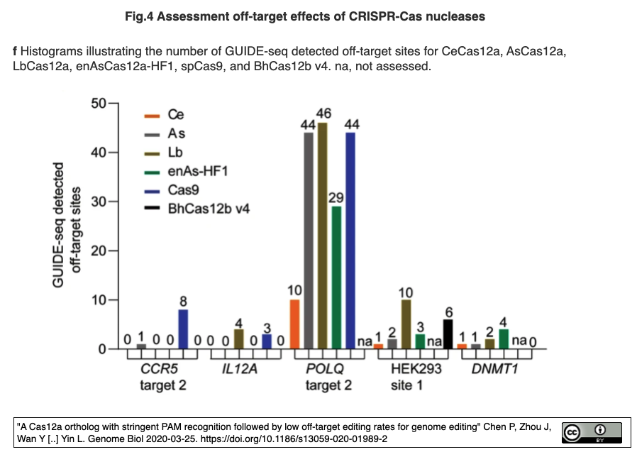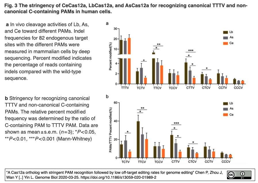 [出典] "A Cas12a ortholog with stringent PAM recognition followed by low off-target editing rates for genome editing" Chen P, Zhou J, Wan Y [..] Yin L. Genome Biol 2020-03-25.