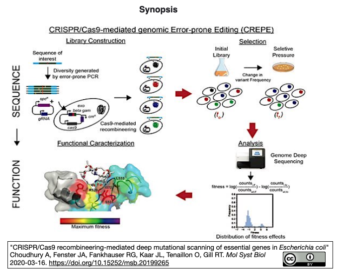 [出典] "CRISPR/Cas9 recombineering‐mediated deep mutational scanning of essential genes in Escherichia coli" Choudhury A, Fenster JA, Fankhauser RG, Kaar JL, Tenaillon O, Gill RT. Mol Syst Biol 2020-03-16; CREPEは"CRISPR/Cas9-mediated genomic error-prone edting"に由来する。