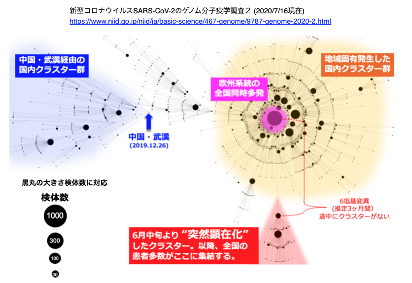 感染研のWebページから引用した右図で注目すべき点は、オレンジ色の背景をつけたネットワークの中央部に位置している欧州系由来で3月下旬に全国同時多発したクラスターのウイルスに対して、一気に [*] 6塩基の変異が新たに加わったウイルスのクラスターが6月下旬に顕在化したことである。[*] 3ヶ月間に6塩基の変異は1ヶ月に2塩基の変異に相当し、分子疫学調査1の時点と変異速度が早まったわけではない。この6月のクラスターを3月のクラスターに紐付ける感染者もクラスターもこれまでのところ発見されていないため、6塩基の新たな変異を帯びたクラスターが突然現われたように見える [右図点線部分参照]。