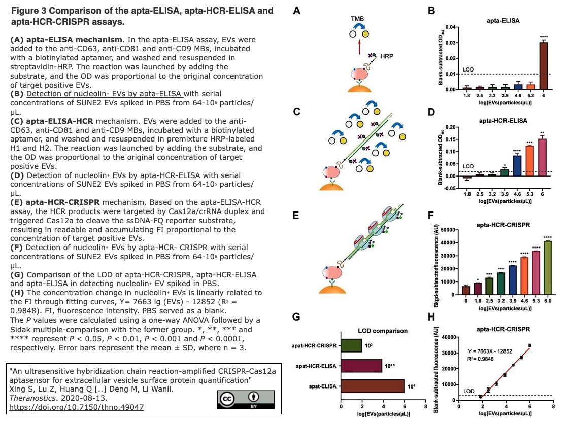 [出典] "An ultrasensitive hybridization chain reaction-amplified CRISPR-Cas12a aptasensor for extracellular vesicle surface protein quantification" Xing S, Lu Z, Huang Q [..] Deng M, Li W. Theranostics. 2020-08-13.