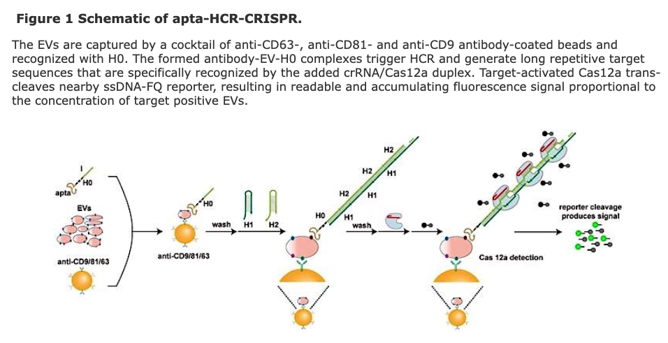 腫瘍由来細胞外小胞 (Tumor-derived extracellular vesicle: TEV)が帯びているタンパク質バイオマーカーは、癌の診断と予後判定に有用である。中山大学を主とする研究グループは今回、標題の新たなTEV表面のタンパク質腫瘍マーカー検出法を開発し、apta-HCR-CRISPRアッセイとして発表した [Figure 1引用下図参照]: