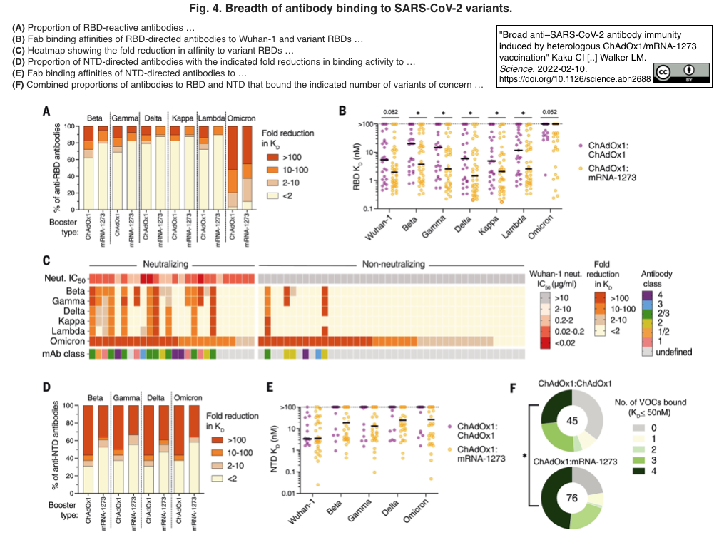 2月24日のNature Medicine 誌掲載News & Views記事は,互いに独立な4種類のブースター接種の解析結果を「mRNAワクチンを追加接種することがオミクロン変異株に対する中和抗体の生成に重要であること,一方で,より優れた治療用抗体が必要である」とまとめた上で,第4回接種 (2回目のブースター接種)が,新型コロナウイルスに対する免疫応答を増強する可能性を示唆した [Figure 1参照].