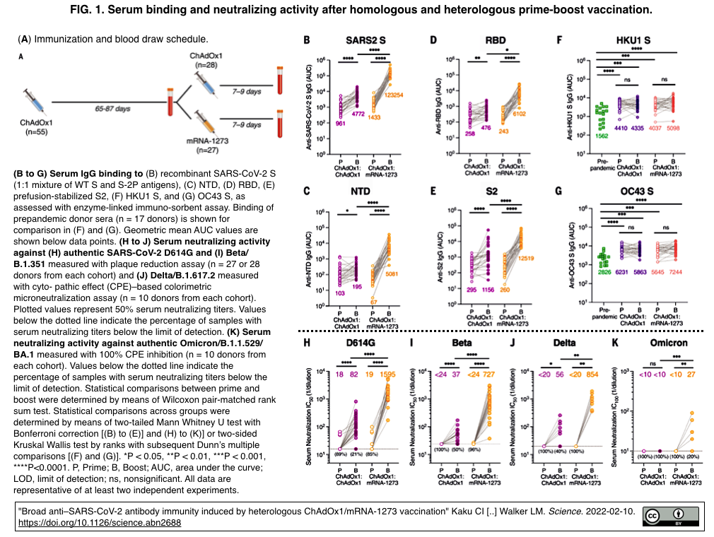 - 同種接種に対して異種接種が,野生型のSARS-CoV-2および懸念される変異株 (variants of concern, VOC)に対してより強力かつ広域な血清中和抗体およびMBC反応を誘導した.