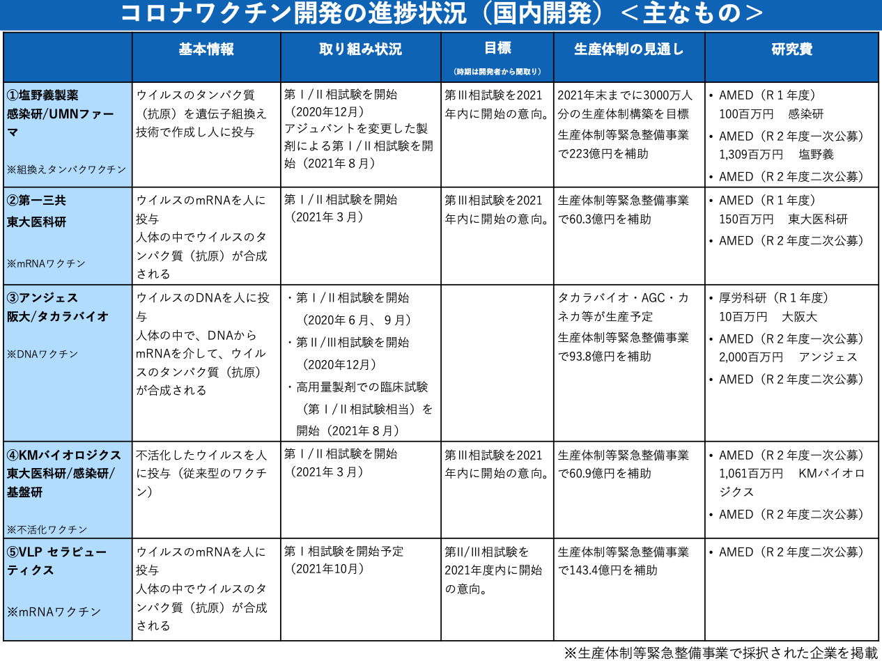- 今回の開発で、mRNAワクチンに関する開発・評価・大量生産に加えてロジスティックスのノウハウが蓄積され、また、今後、安全性のデータが蓄積されていくことから、仮に、現行mRNAワクチンに対する耐性を帯びた新型コロナウイルスの変異株が発生したとしても、緊急使用可能なmRNAワクチンの迅速生産を期待できそうである。