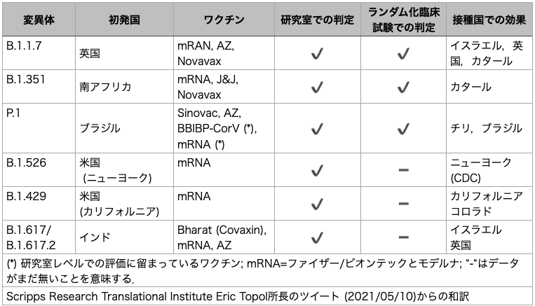 Scripps Research Translational InstituteのEric Topol [*]がツイート (2021/05/10)した「各種変異株 (英国, 南ア, ブラジル, 米国, およびインド由来)に対する各種ワクチンの有効性を,各種資料からまとめた表」を一部和訳し右図に掲載した [* https://en.wikipedia.org/wiki/Eric_Topol] .オリジナルの表には参考文献が付されていなかったが,カタールでの評価については,crisp_bio記事「新型コロナウイルス: ファイザー社とビオンテック社のmRNAワクチン'BNT162b27'」https://crisp-bio.blog.jp/archives/24484684.htmlの"2021-05-10 BNT162b2の接種国のカタールでの評価"の項参照.