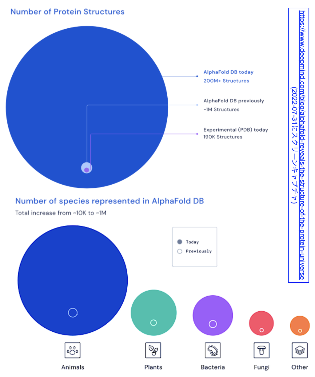 [出典] "AlphaFold reveals the structure of the protein universe" Demis Hssabis. DeepMind 2022-07-28. https://www.deepmind.com/blog/alphafold-reveals-the-structure-of-the-protein-universe; "‘New era in digital biology’: AI reveals structures of nearly all known proteins" Travis J. Science 2022-07-29. https://doi.org/10.1126/science.ade1829