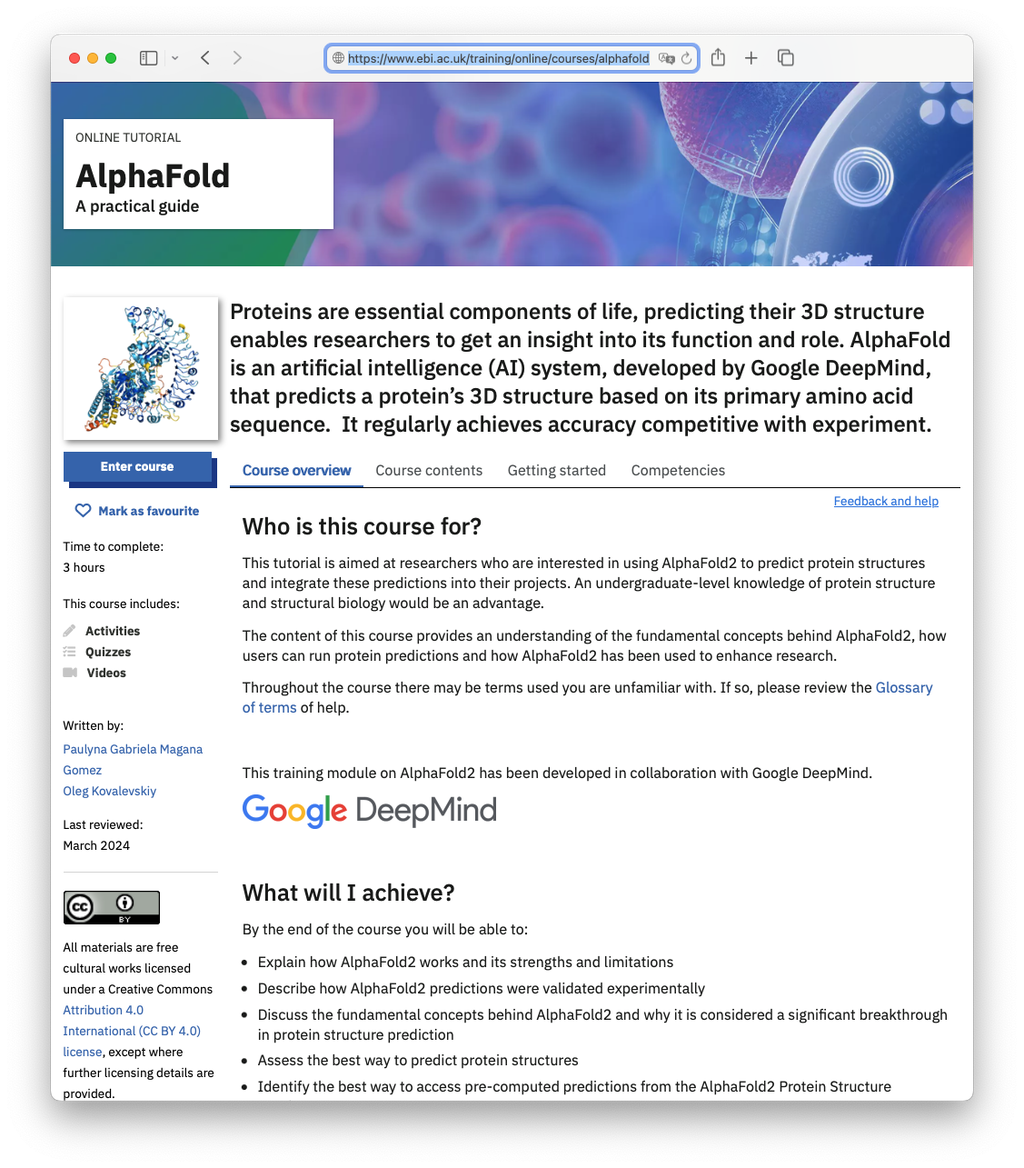 2024-03-07 EMBL-EBIがAlphaFoldの実践的ガイドを公開- 3時間コースhttps://www.ebi.ac.uk/training/online/courses/alphafold/;右図はスクリーンショット