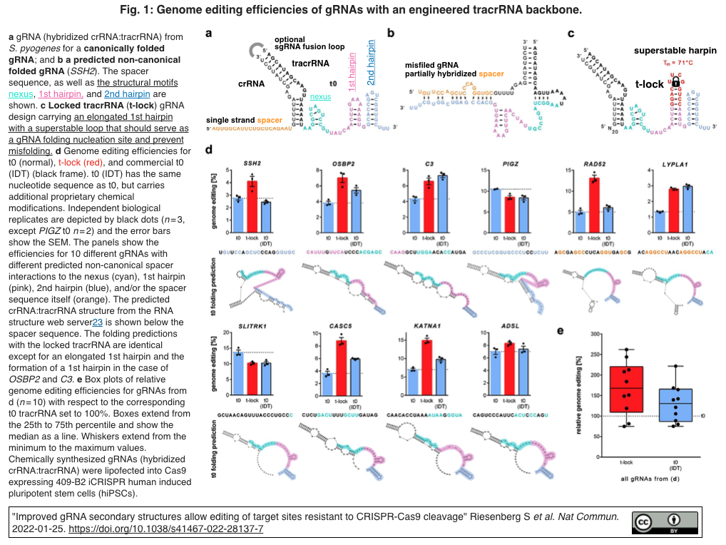 [出典] "Improved gRNA secondary structures allow editing of target sites resistant to CRISPR-Cas9 cleavage" Riesenberg S et al. Nat Commun. 2022-01-25. https://doi.org/10.1038/s41467-022-28137-7