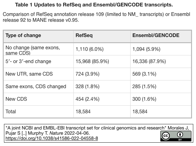 [出典] "A joint NCBI and EMBL-EBI transcript set for clinical genomics and research" Morales J, Pujar S [..] Murphy T. Nature 2022-04-06. https://doi.org/10.1038/s41586-022-04558-8; NEWS "The MANE collaboration: working together to support genome science" EMBL-EBI. 2022-04-06. https://www.ebi.ac.uk/about/news/research-highlights/the-mane-collaboration-working-together-to-support-genome-science/