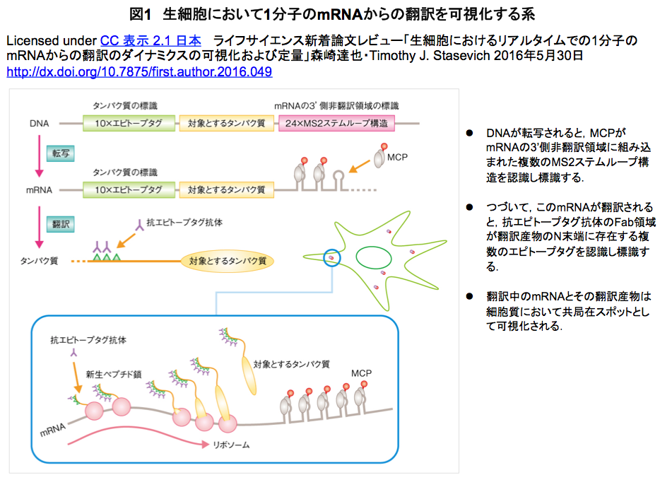 - ライフサイエンス新着論文レビュー「生細胞におけるリアルタイムでの1分子のmRNAからの翻訳のダイナミクスの可視化および定量」森崎達也・Timothy J. Stasevich 2016年5月30日;Science. 2016 Jun 17;352(6292):1425-9. doi: 10.1126/science.aaf0899. Epub 2016 May 5.