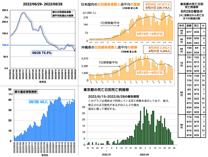 2022-08-28 21:28 都の日別感染者数の推移は15,834人 (< 17,126人 < 18,423人 < 23,129人)、日別感染者数の7日間移動平均(週平均) の推移は19,544.4人 (< 20,822.4人 < 21,986.9人 < 23,308.7人)、週平均前週比の推移は75.5% (< 81.3% < 86.6% < 95.7%)と順調な低下が再開した [挿入図左上グラフ参照]。