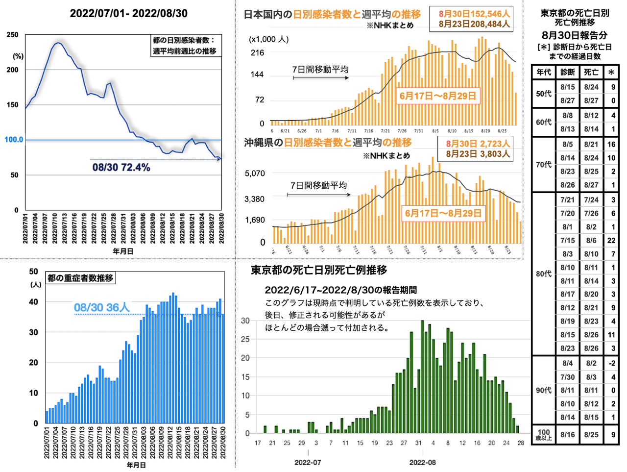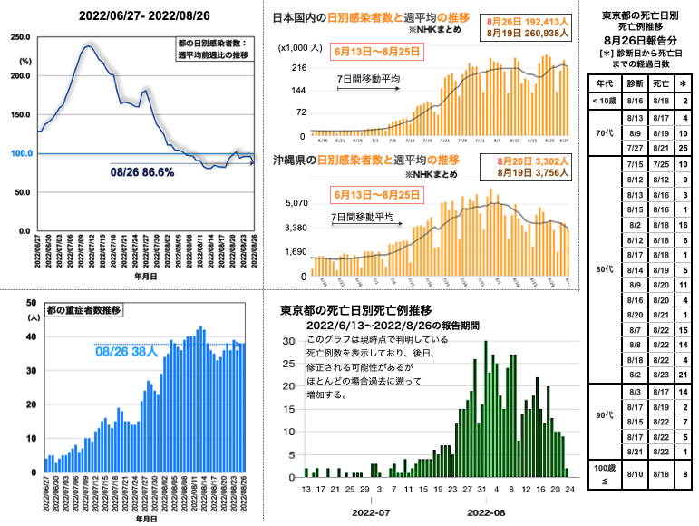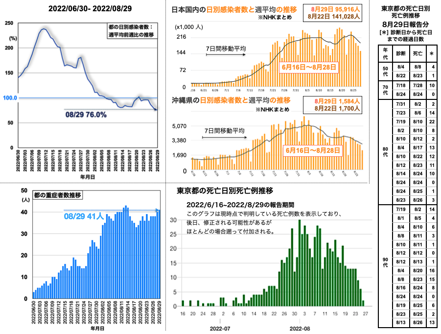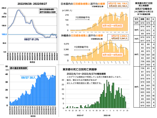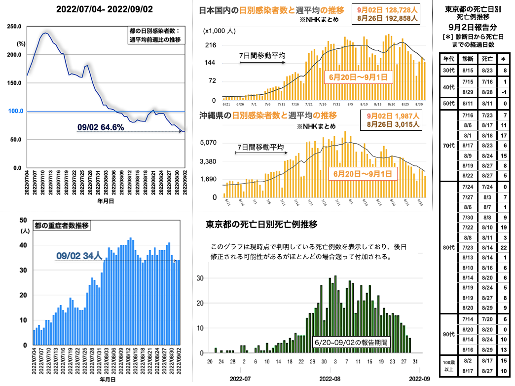 都の重症者数の推移は34人 (=34人 > 33人 < 36人) [挿入図 左下グラフ参照]となった。都の死亡日別死亡例報告数は30代 1例, 40代 2例, 50代 1例を含む30例が加わり、7月6日から8月29日まで死亡例が続いている [挿入図下段右側のグラフと表参照]。9月2日、都の病床使用率の推移は46.9% (< 47.4% < 48.8% < 50.7%)、PCR・抗原検査の陽性率の推移は36.9% (< 38.1% < 39.0% < 39.6%)、自宅療養者数の推移は92,212人 (< 98,740人 > 94,241人 < 98,968人)といずれも低減した。全国の重症者数の推移は、539人 (< 555人 < 591人 < 618人)と昨日から16人減となった。全国の日別感染者数は128,728人 (< 149,906人 < 169,800人 > 152,546人)と先週金曜日からは64,130人減の0.67倍となった [挿入図中央上段グラフ参照]。沖縄県の新規感染者数は1,987人で先週金曜日から1,028人減の0.66倍となった。週平均の推移は、全国も沖縄県も下降が続いている [挿入図右寄り上の2つグラフ参照]。沖縄県の病床使用率は57.1% (< 59.8% > 56.5% < 59.0% < 60.5%)と昨日より持ち直した [沖縄タイムス・プラス2022-09-02 15:53]。