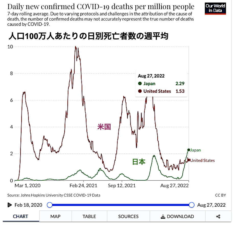 ワクチン接種も比較的進んできた日本の新規感染者数が世界有数になったこと (8月15日~21日の週間感染者数は147万6347人で世界最多)、また、他国に比べて圧倒的に死者数が抑制されていたが8月後半からこれも世界有数になってしまったこと (8月15日~21日の死者数1,624人は世界第2位)について、検査数の違い、過去の感染から獲得された免疫の違い、重症化リスクを下げる治療薬の活用度合い、医療の効率などが、論じられているようだ [FNNプライムオンライン 2022-08-25 17:10]。人口100万人あたりの死者数の7日間移動平均を米国と比較すると、8月10日に米国を超え、8月27日時点では米国のほぼ1.5倍であり [Our World in Data Webサイトで比較]、また「自社比較」では、過去最悪の状況である。