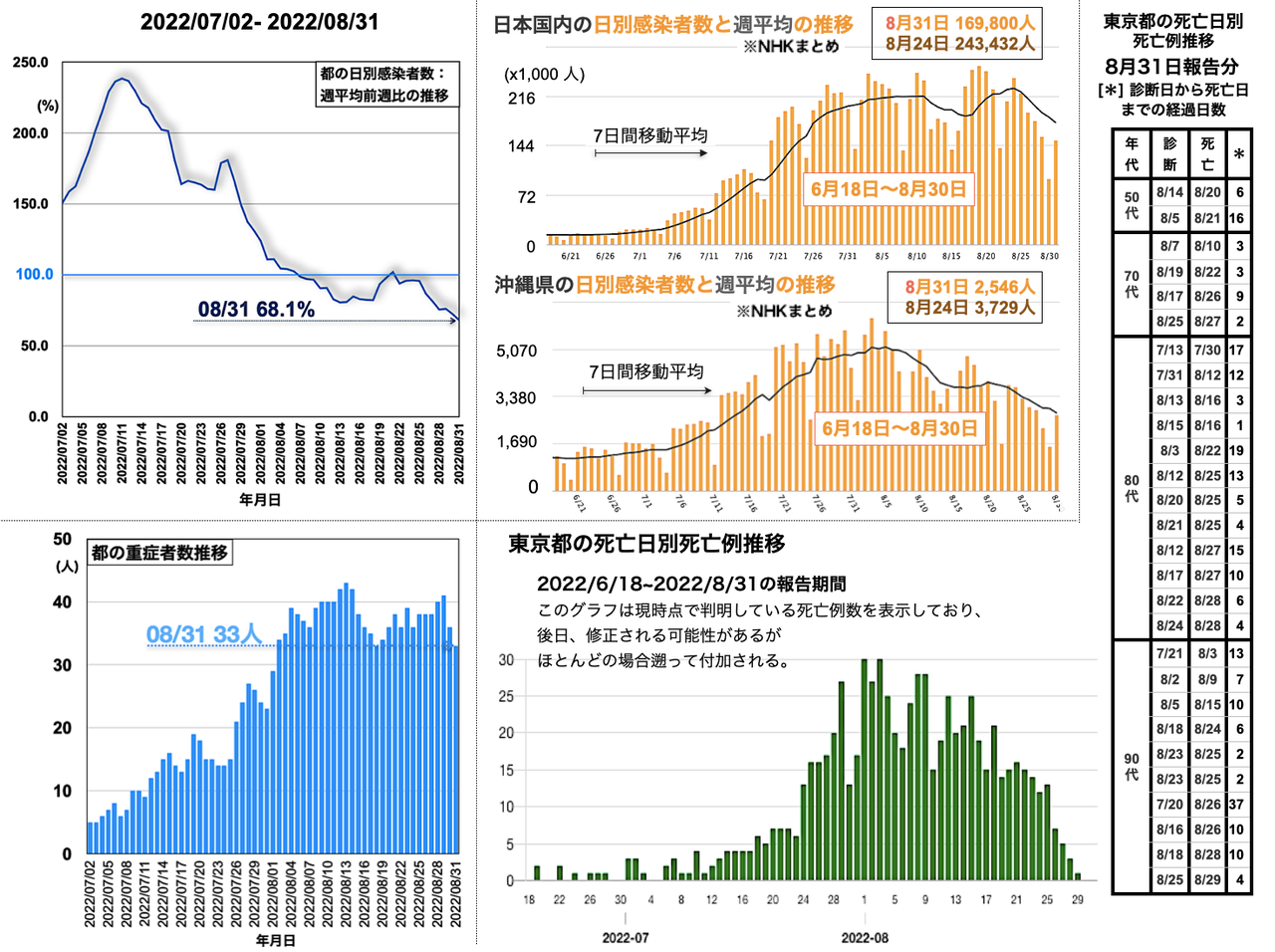 都の重症者数の推移は33人 (< 36人 < 41人 > 40人) [挿入図 左下グラフ参照]となった。都の死亡日別死亡例報告数は50代 2例を含む28例が加わり、死亡例が7月6日から8月29日まで続くことになった [挿入図中央から右の下段のグラフと表参照]。8月31日、都の病床使用率の推移は48.8% (< 50.7% < 52.5% < 53.4%)、PCR・抗原検査の陽性率の推移は39.0% (< 39.6% < 40.6% < 41.9%)、自宅療養者数の推移は94,241人 (< 98,968人 < 108,564人 < 111,138人)といずれも低下が続いた。