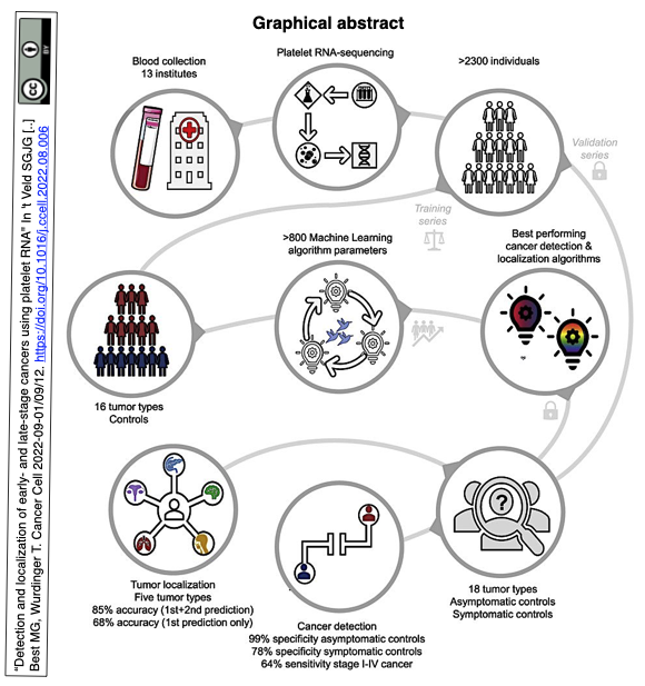 [出典] "Detection and localization of early- and late-stage cancers using platelet RNA" In 't Veld SGJG [..] Best MG, Wurdinger T. Cancer Cell 2022-09-01/09/12. https://doi.org/10.1016/j.ccell.2022.08.006 [著者所属] Amsterdam UMC Location Vrije Universiteit Amsterdam, Cancer Center Amsterdam and Liquid Biopsy Center, Brain Tumor Center Amsterdam, Neuroscience Campus Amsterdam, the Netherlands Cancer Institute – Antoni van Leeuwenhoek Hospital, Harvard Medical School