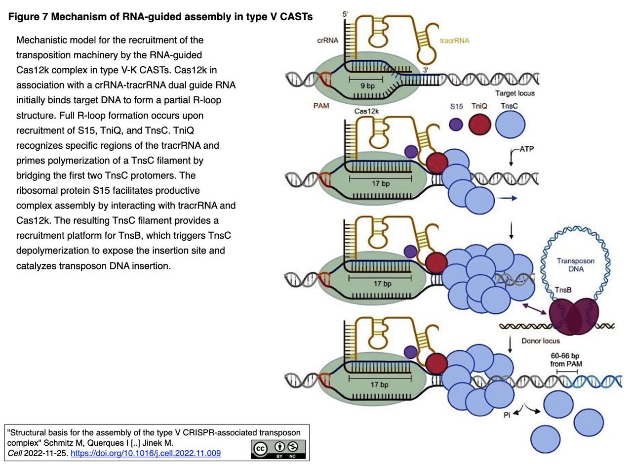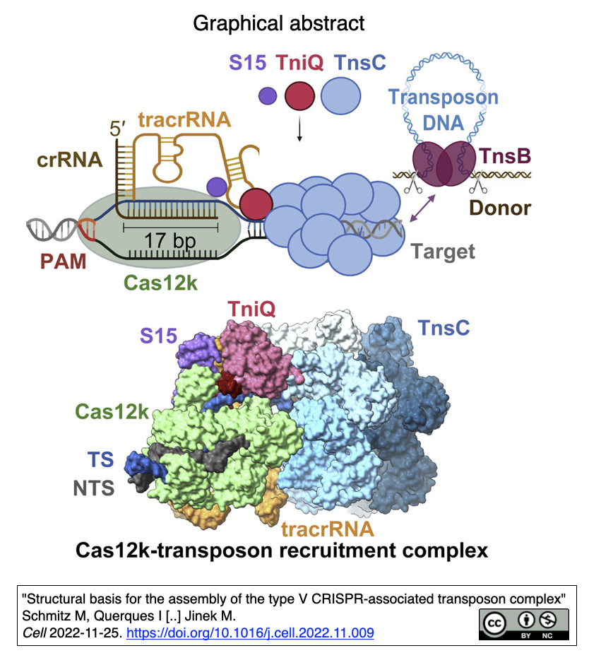 Cas12k、AAA+ ATPase TnsC、Zn-finger protein TniQ、トランスポザーゼTnsBの協働に依存することが知られている。Jinekが率いる研究チームは今回、クライオ電顕法により、RNA誘導型Cas12k、TniQ、高分子TnsCフィラメント、そして予想外にリボソーム蛋白質S15からなる標的DNA結合型Cas12k-トランスポゾン・リクルーメント複合体の構造を明らかにし [グラフィカルアブストラクト引用右図参照]、V-K CASTの分子機序モデルを提唱した [Figure 7から引用した左下図参照] :