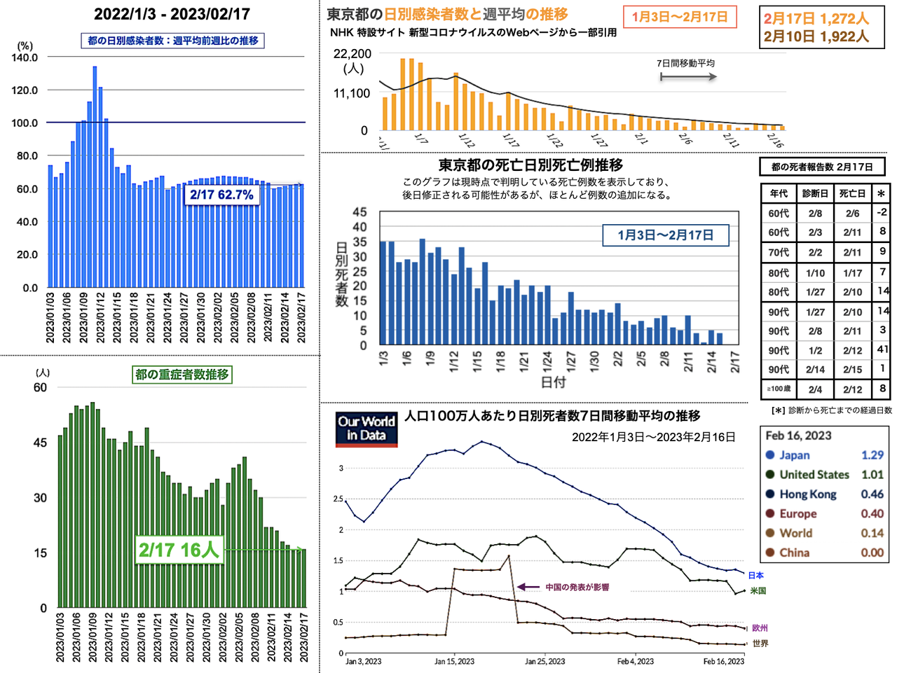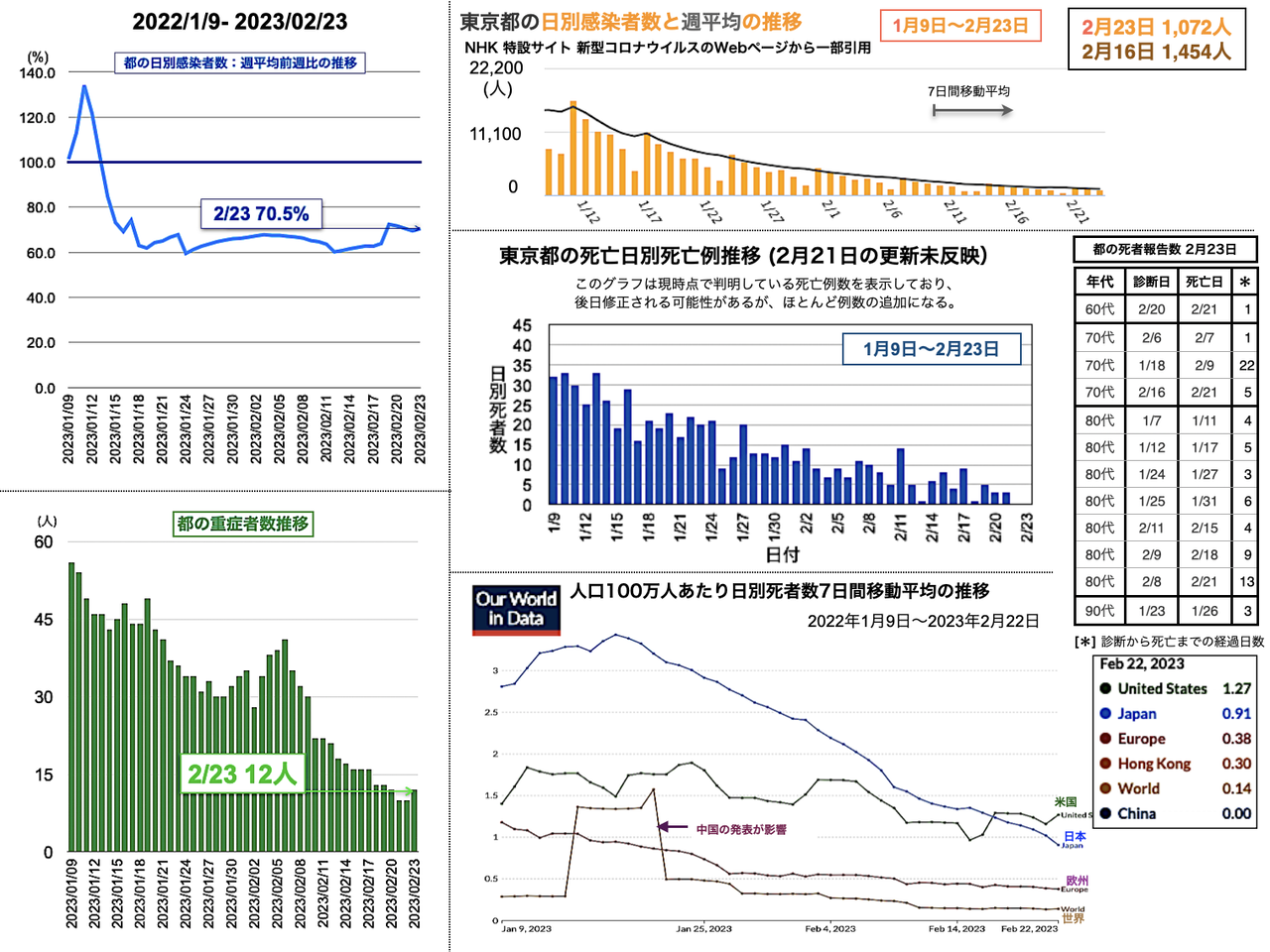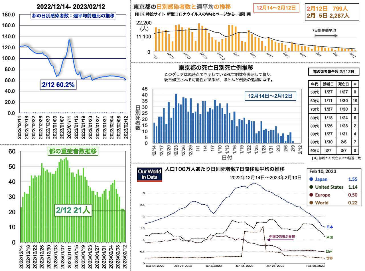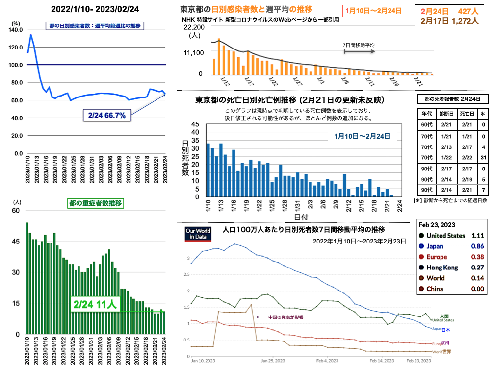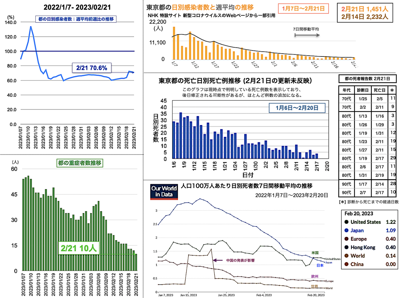 世界の日別死者数週平均のグラフは1月9日から22日までの期間であり22日時点で、日本は1月18日のピーク3.43人から1.02人へと低下、米国は2月3日の1.64人から21日に1.14人まで低下したが22日に1.27人と反転し、欧州は1月5日の1.18人からおおむね低下が続き0.38人へ、香港は0.30人へ、中国は相変わらず0人を維持した。報道によると、中国の衛生当局が23日に記者会見を開き「新型コロナウイルスの感染拡大は基本的に終息」と勝利宣言をした。また、9日までの1週間の死者は912人とした [日テレNEWS 2023-02-23 17:37]。