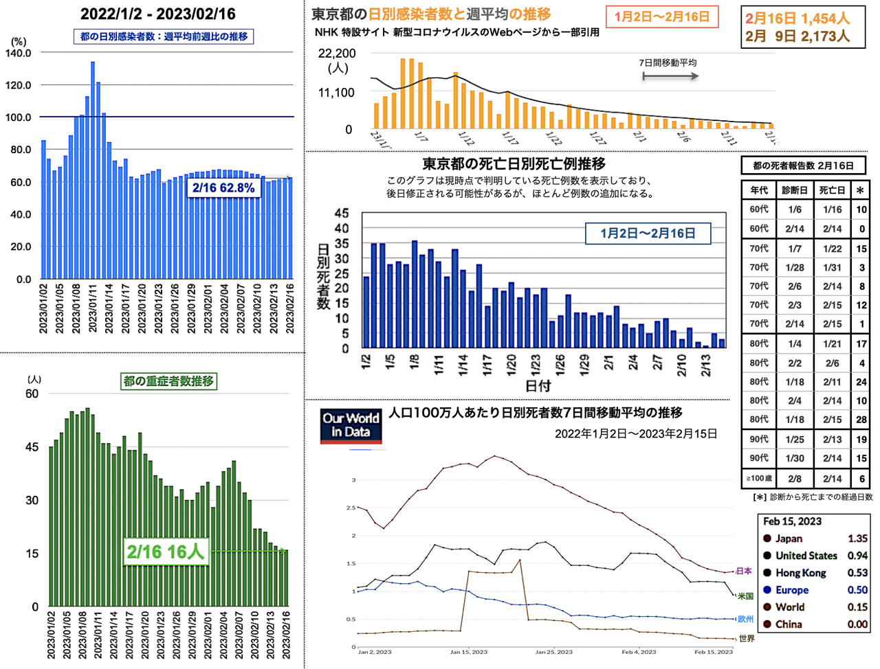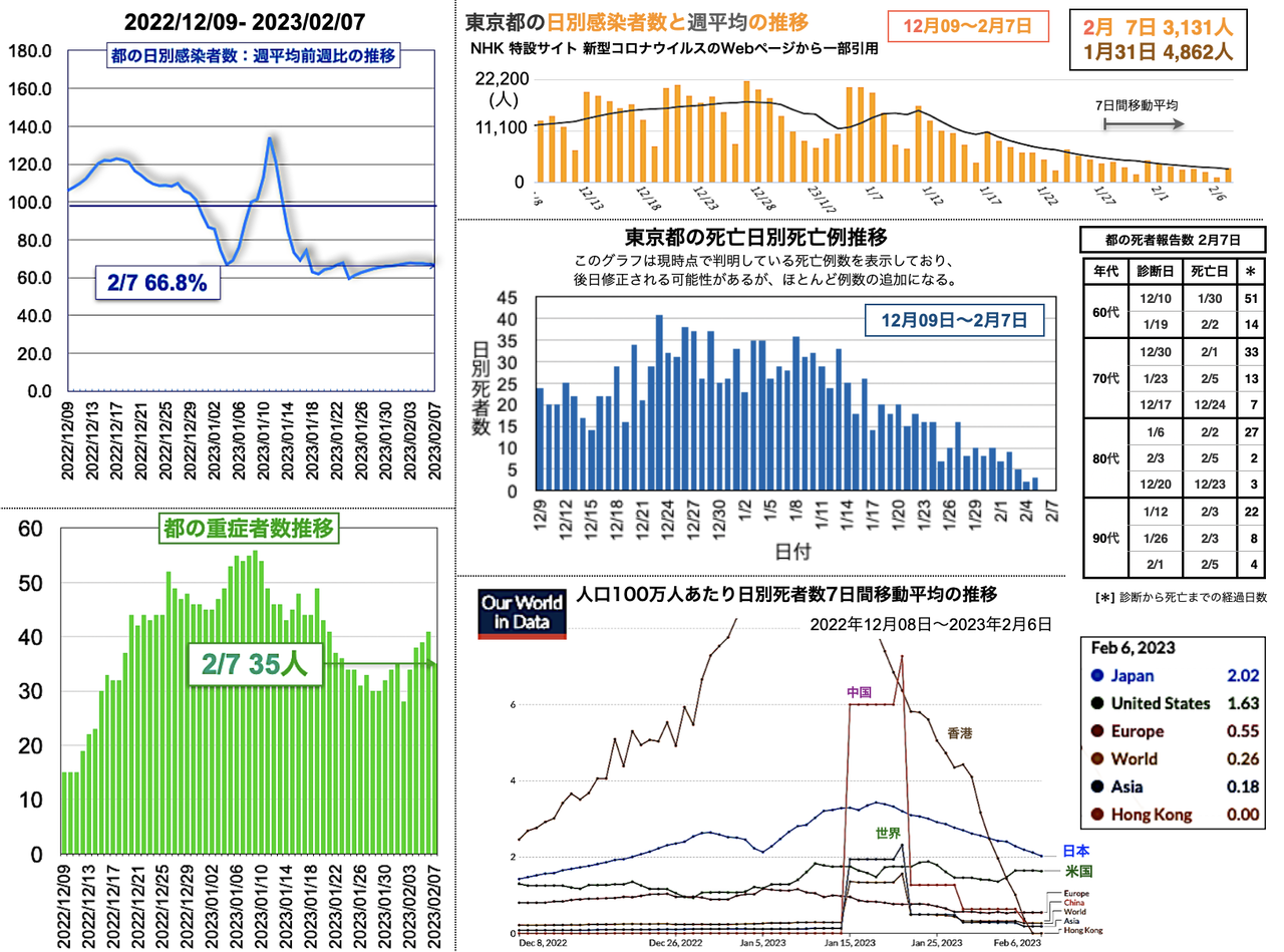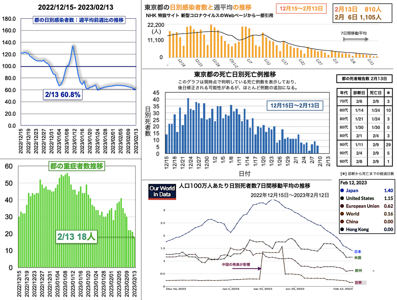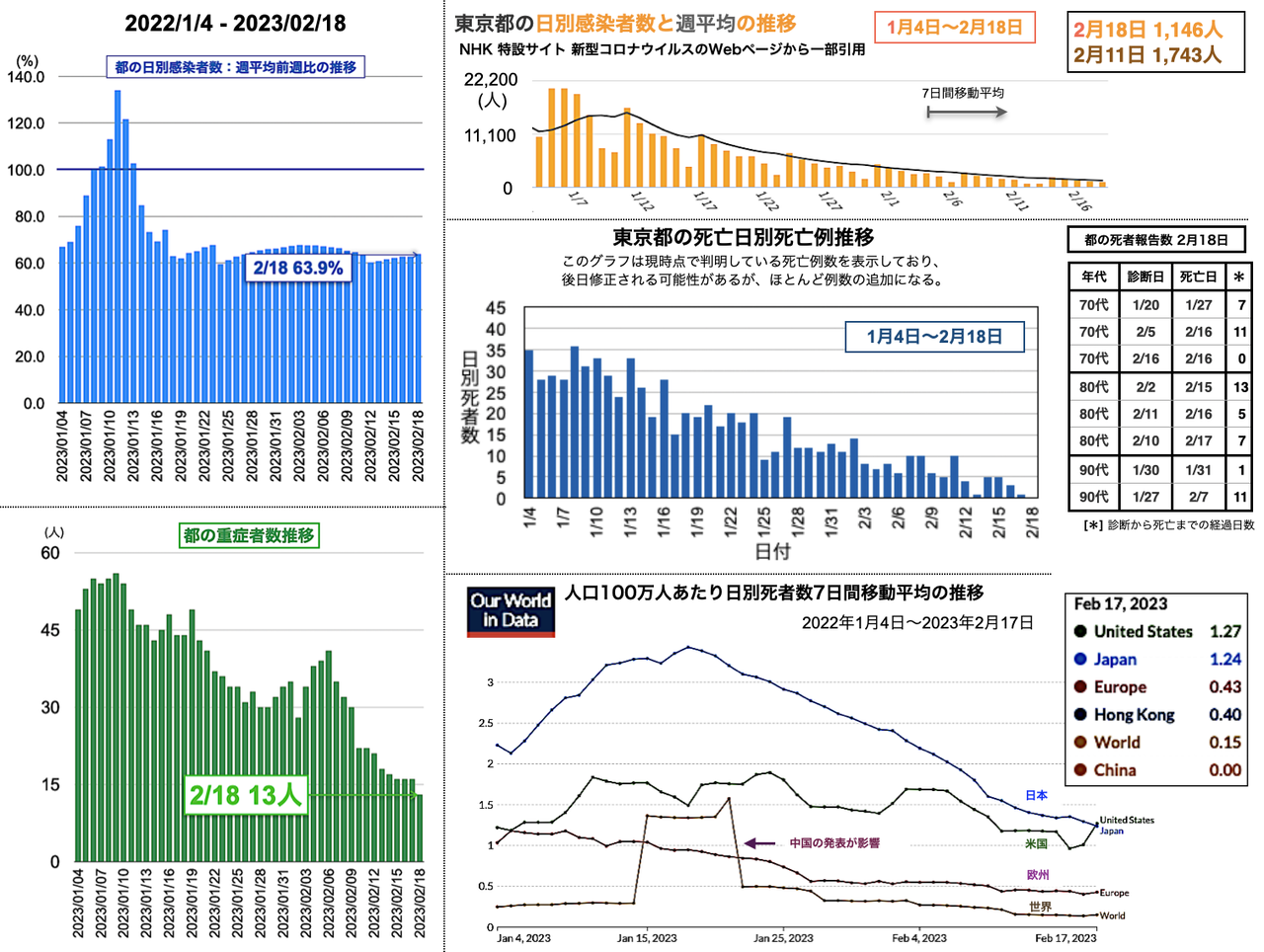 世界の日別死者数週平均のグラフは1月9日から22日までの期間であり22日時点で、日本は1月18日のピーク3.43人から1.02人へと低下、米国は2月3日の1.64人から21日に1.14人まで低下したが22日に1.27人と反転し、欧州は1月5日の1.18人からおおむね低下が続き0.38人へ、香港は0.30人へ、中国は相変わらず0人を維持した。報道によると、中国の衛生当局が23日に記者会見を開き「新型コロナウイルスの感染拡大は基本的に終息」と勝利宣言をした。また、9日までの1週間の死者は912人とした [日テレNEWS 2023-02-23 17:37]。