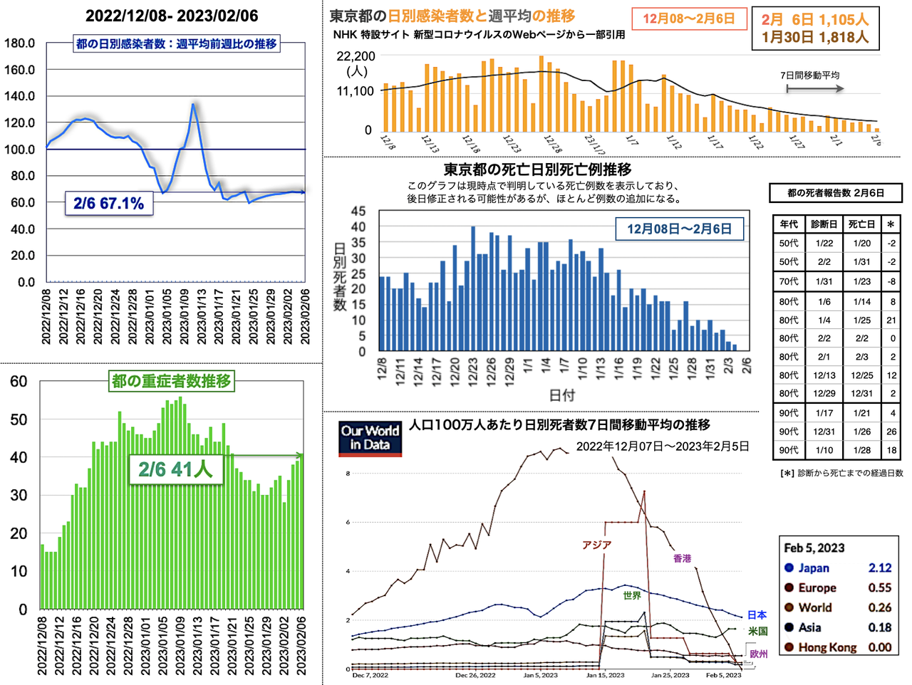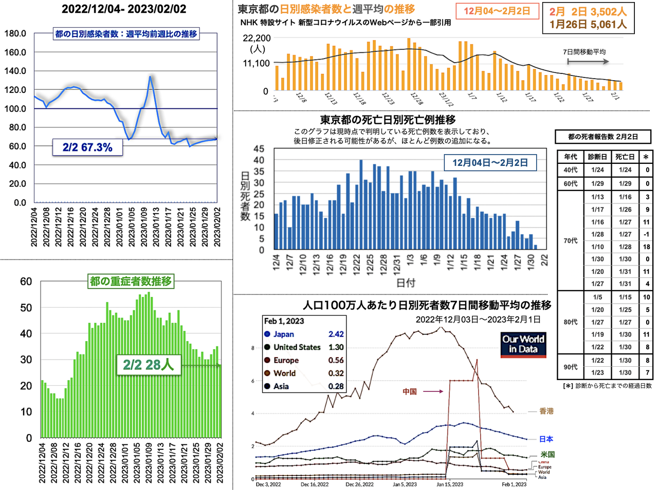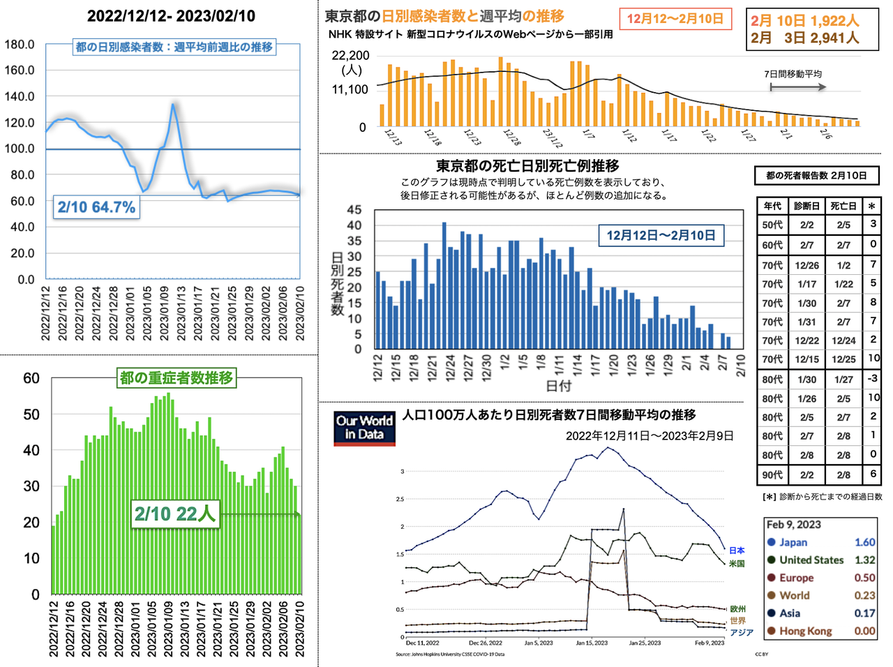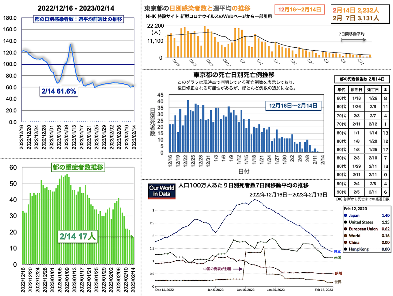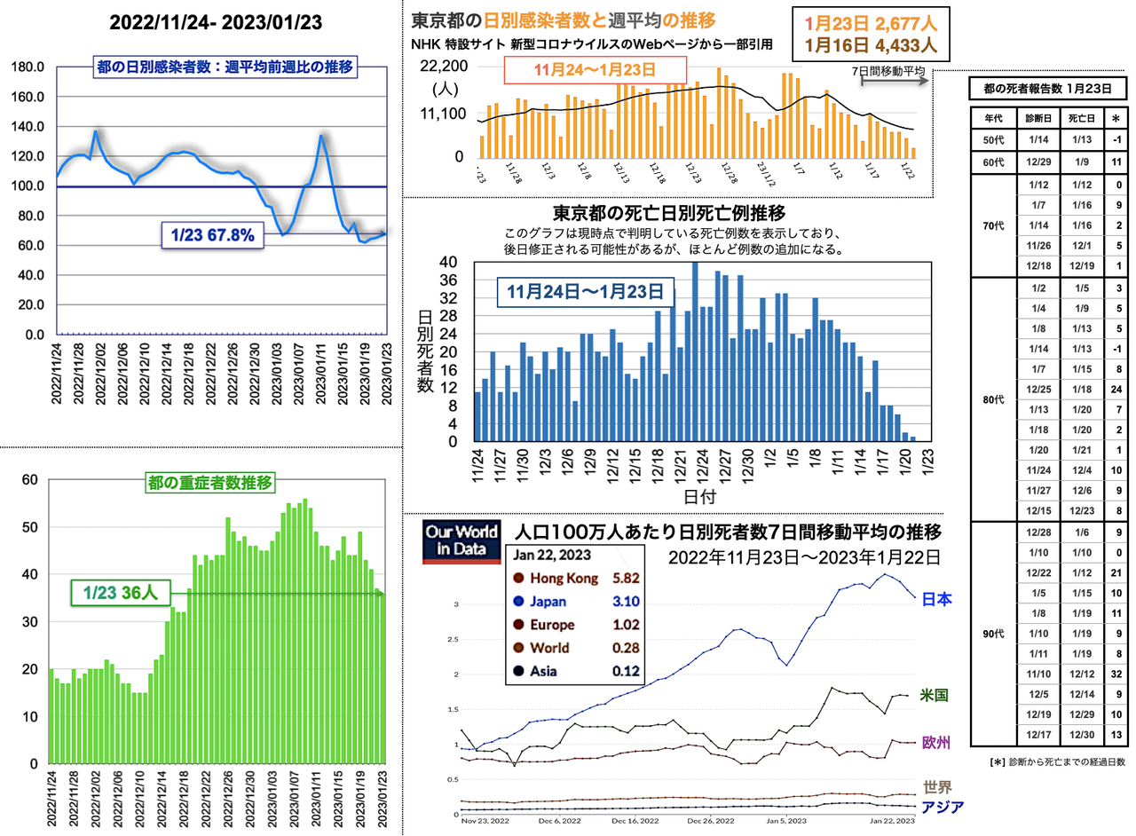 世界の日別死者数週平均のグラフは1月9日から22日までの期間であり22日時点で、日本は1月18日のピーク3.43人から1.02人へと低下、米国は2月3日の1.64人から21日に1.14人まで低下したが22日に1.27人と反転し、欧州は1月5日の1.18人からおおむね低下が続き0.38人へ、香港は0.30人へ、中国は相変わらず0人を維持した。報道によると、中国の衛生当局が23日に記者会見を開き「新型コロナウイルスの感染拡大は基本的に終息」と勝利宣言をした。また、9日までの1週間の死者は912人とした [日テレNEWS 2023-02-23 17:37]。