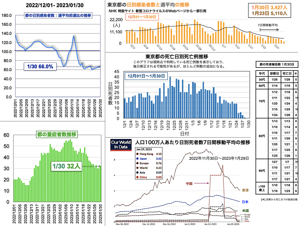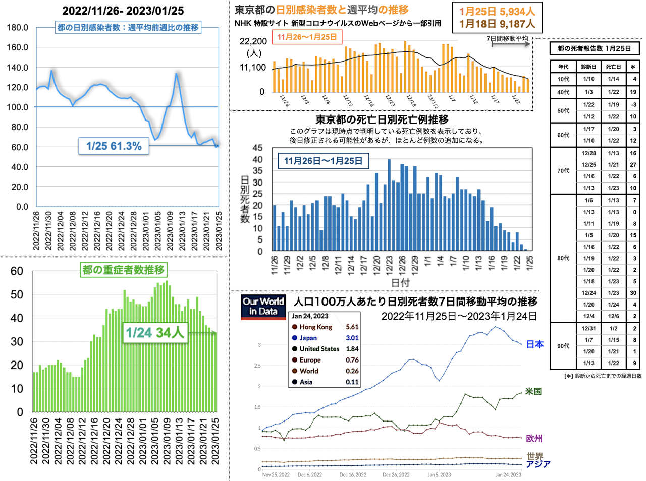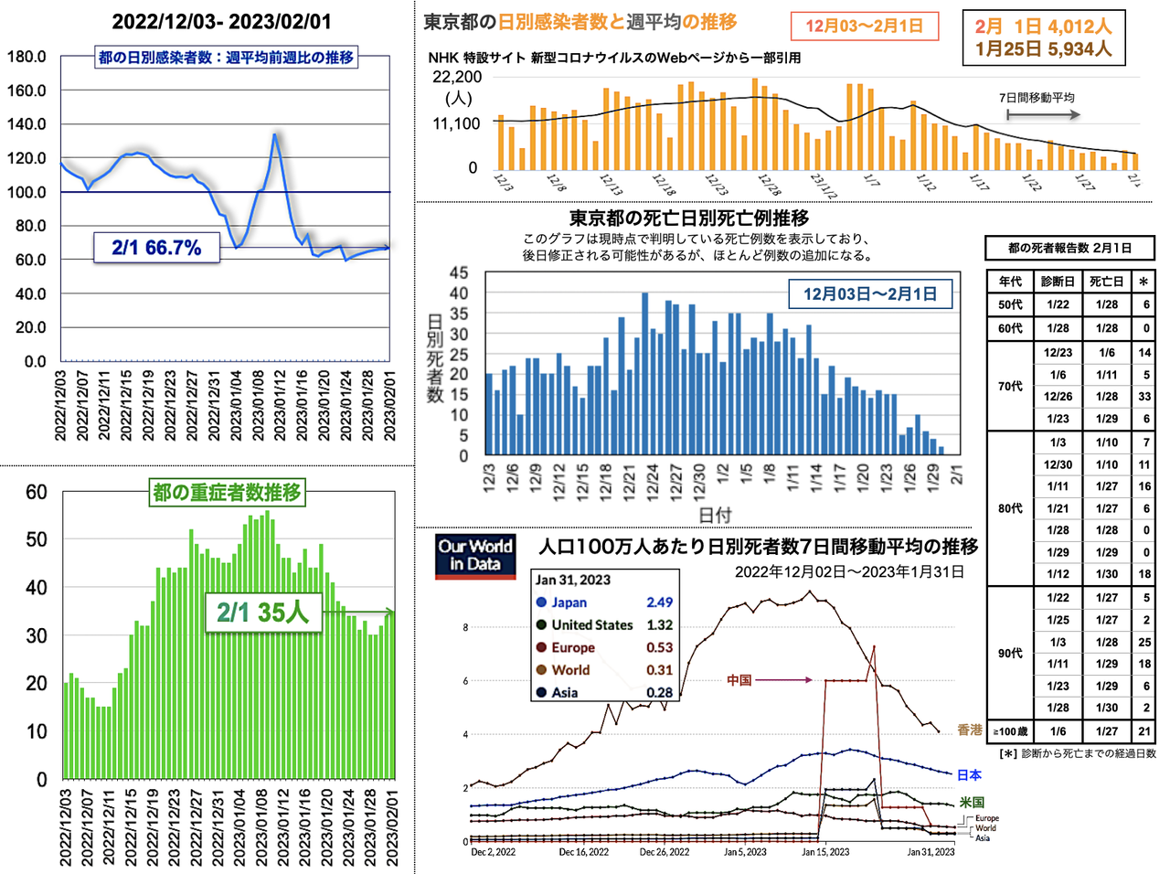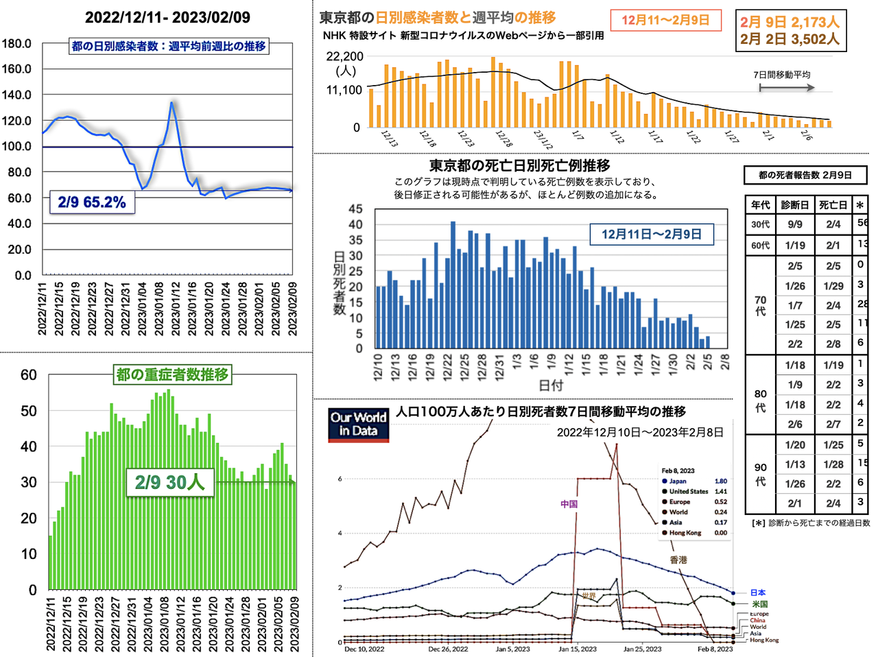 世界の日別死者数週平均のグラフは1月9日から22日までの期間であり22日時点で、日本は1月18日のピーク3.43人から1.02人へと低下、米国は2月3日の1.64人から21日に1.14人まで低下したが22日に1.27人と反転し、欧州は1月5日の1.18人からおおむね低下が続き0.38人へ、香港は0.30人へ、中国は相変わらず0人を維持した。報道によると、中国の衛生当局が23日に記者会見を開き「新型コロナウイルスの感染拡大は基本的に終息」と勝利宣言をした。また、9日までの1週間の死者は912人とした [日テレNEWS 2023-02-23 17:37]。