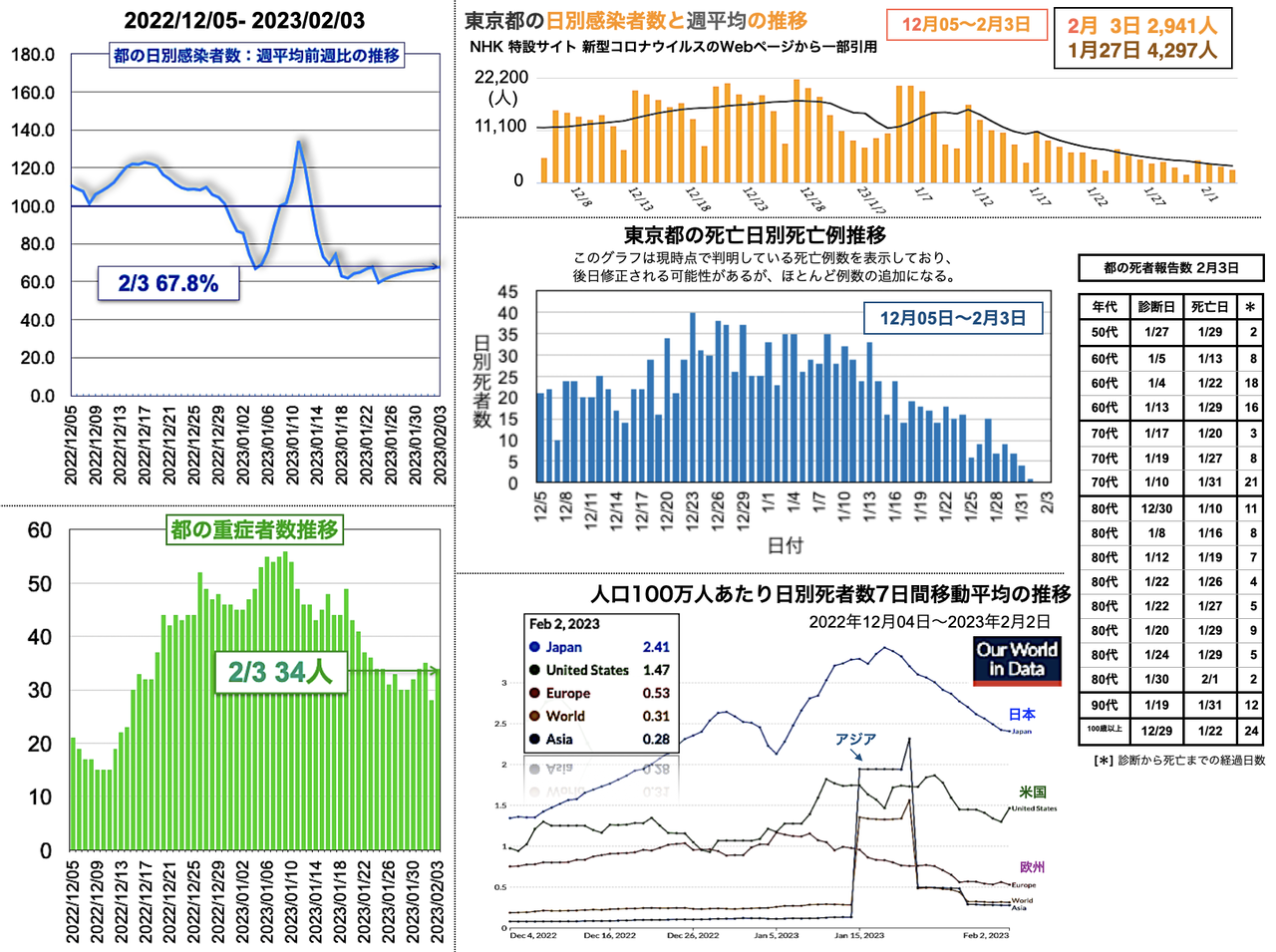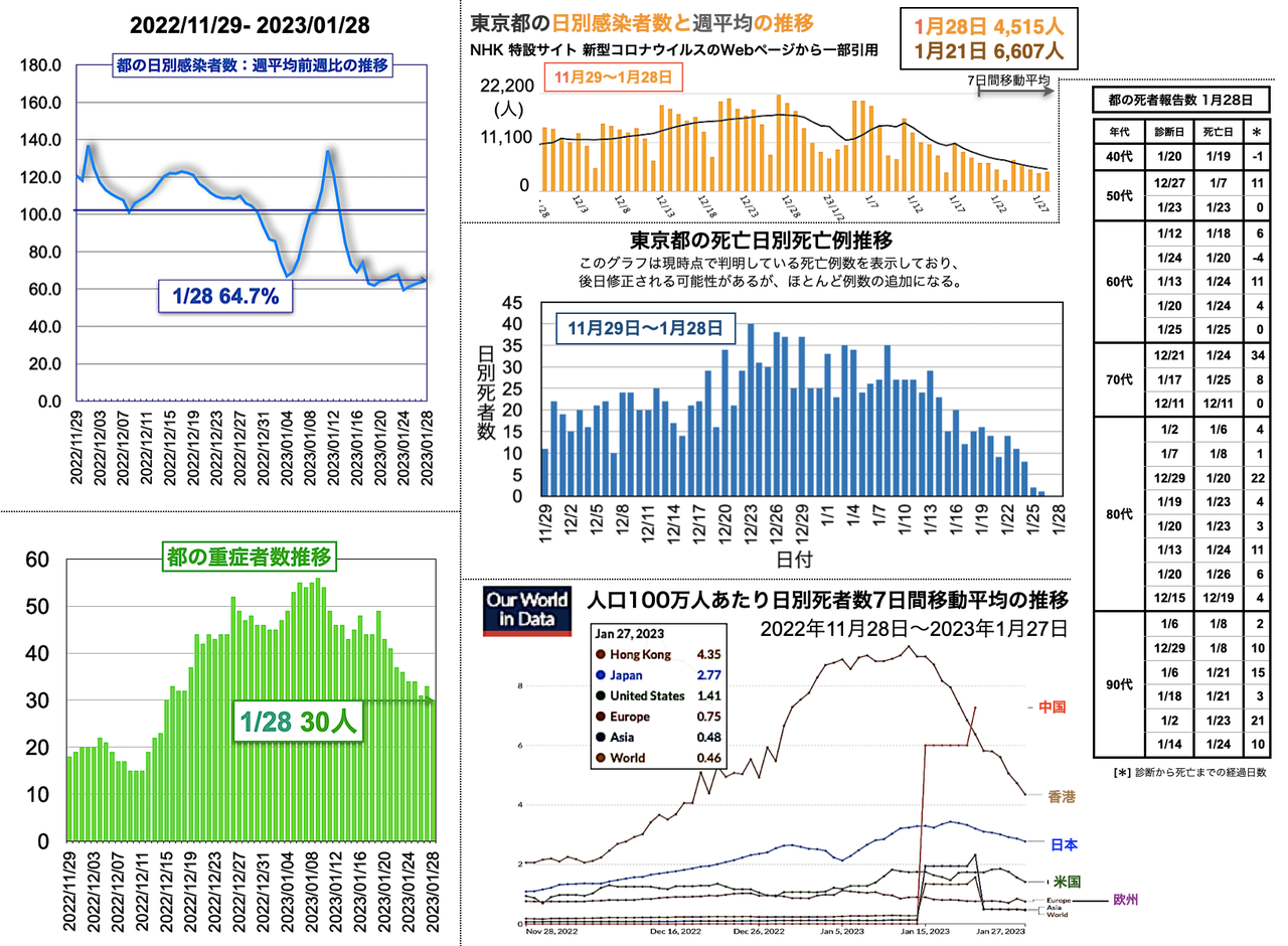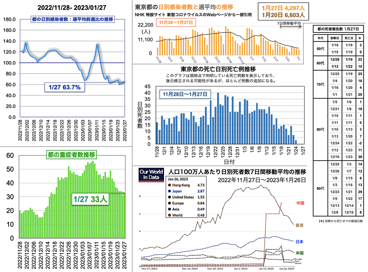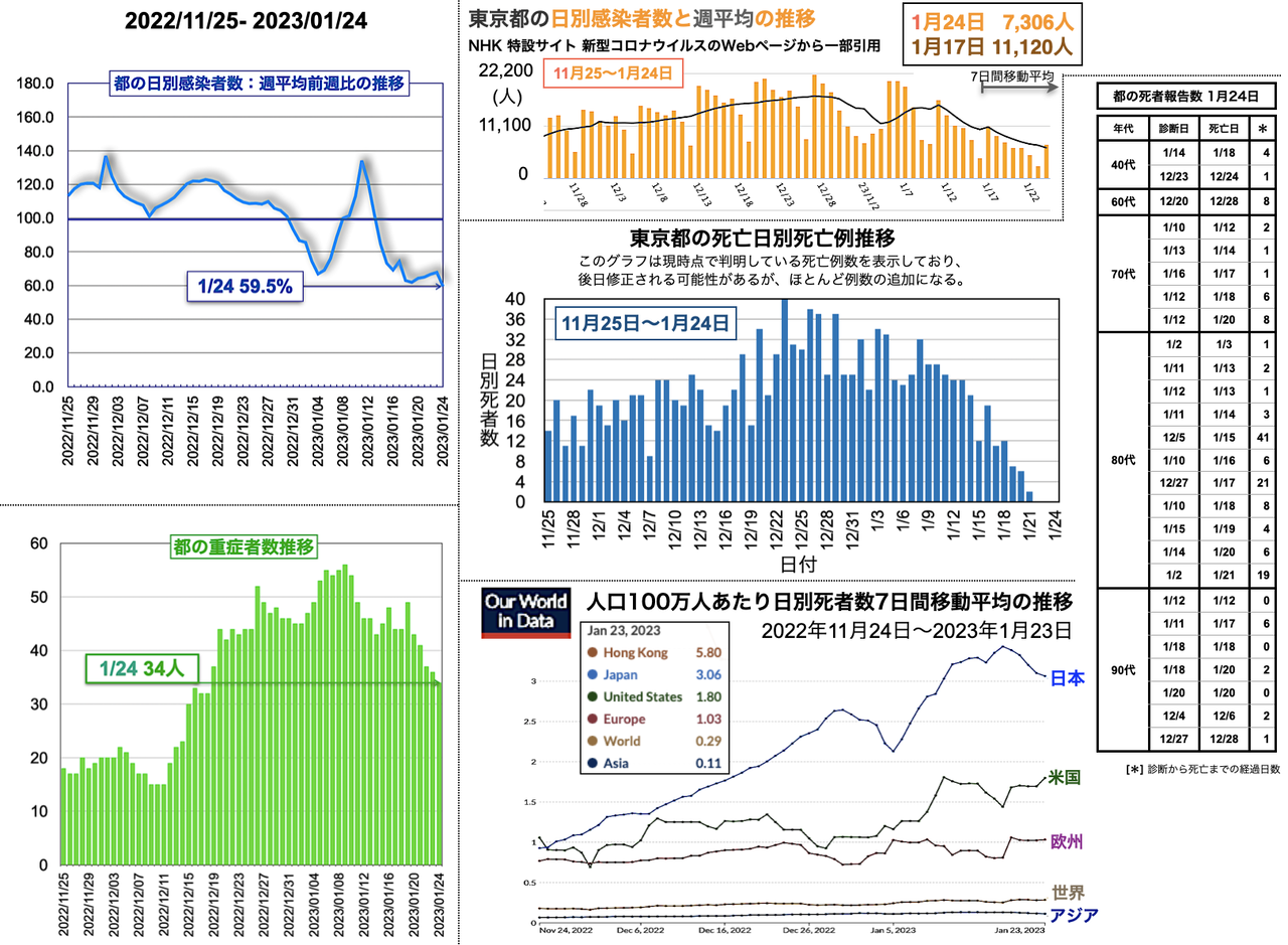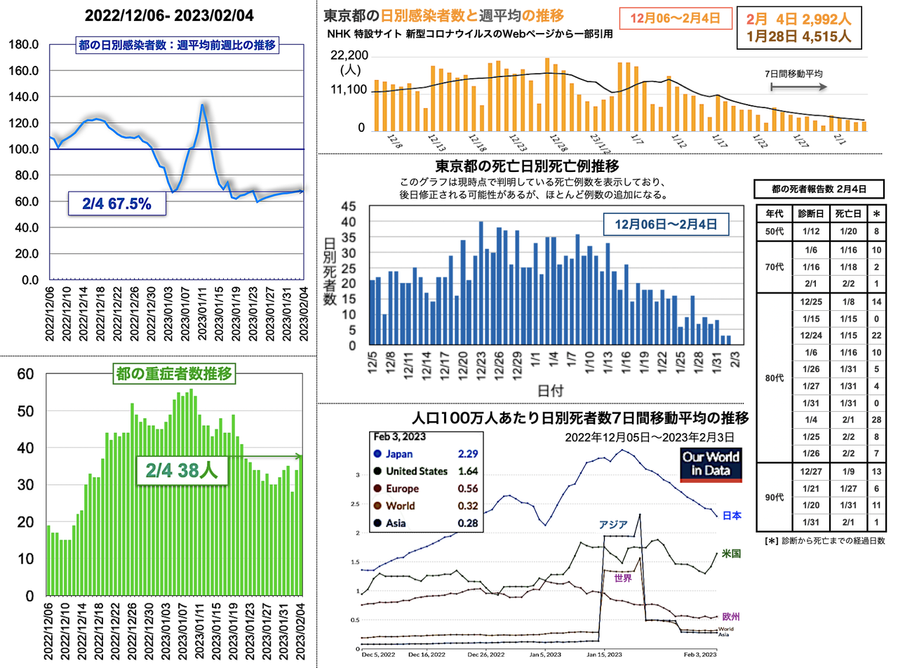 都の死亡日別死亡例報告数には、50代 1例、70代 3例、80代 10例、90代 4例の計18例が加わった[挿入図右側中段のグラフと表参照;挿入図右側下段のグラフは人口100万人当たりの日別死者数7日間移動平均の推移を世界、アジア、欧州、米国と比較したグラフ]。世界の日別死者数週平均の2月3日までの推移は、日本が18日のピーク3.43人から2.29人まで低下、米国は24日の1.86人から2月1日に1.30人と一旦低下したのち2日連続で増加し1.64人に達し、XBB.1.5の感染拡大との相関が気になる。欧州は0.84人から多少の上下があったがこのところほぼ一定で0.56人であった。香港と中国のデータはそれぞれ1月29日と28日で更新が止まっている。