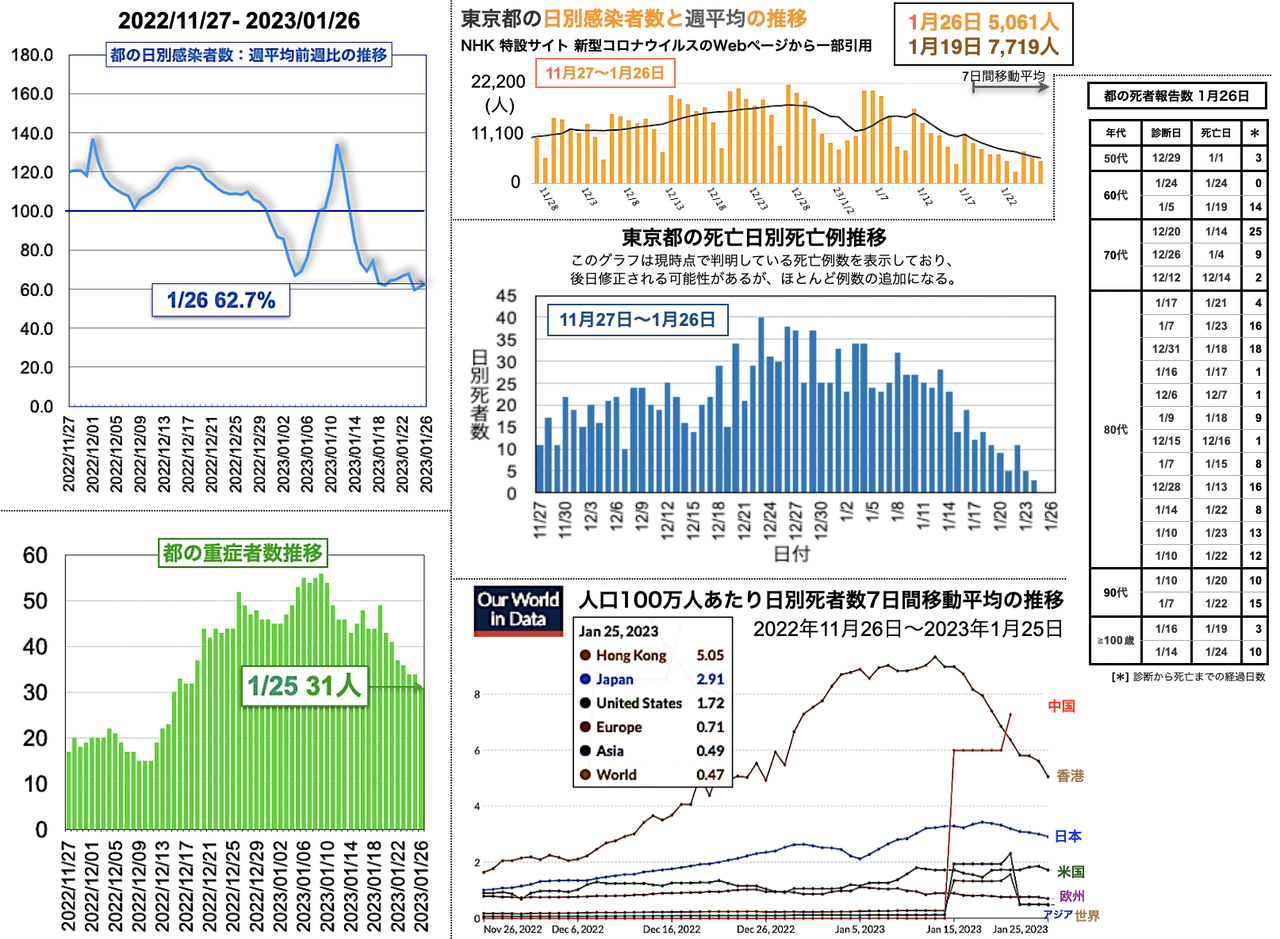 国際的な日別死者数週平均1月23日までの推移は、日本が18日のピーク3.43人から3.06人まで低下、米国が22日から23日にかけて1.70人1.80人へと上昇、欧州は19日からほぼ一定、香港は、13日のピーク9.33人から23日の5.80人まで低下した。
