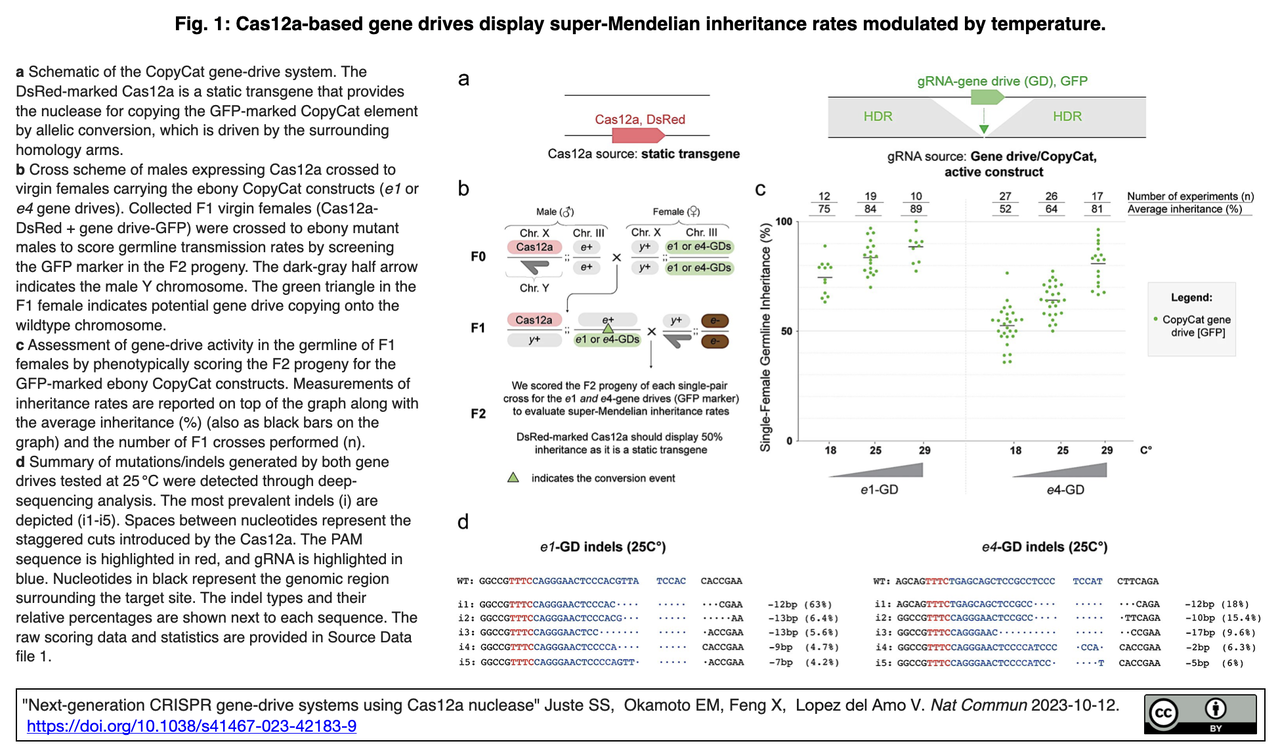 著者らは、キイロショウジョウバエの温度制御型Cas12a遺伝子ドライブシステムの実現可能性を検討した。まず、キイロショウジョウバエの超メンデル遺伝を促進するCas12a遺伝子ドライブシステムを紹介し、Cas12aが生殖細胞において温度依存的に効率的なHDRを引き起こすことを明らかにした [Fig. 1引用左下図参照]。また、Cas9とCas12を異なる染色体に配置する二重遺伝子ドライブシステムを構築し、2つの独立した遺伝要素が同一生物内で同時に拡散することを実証した [Fig. 2 の一部 (a/b)引用右下図参照]。