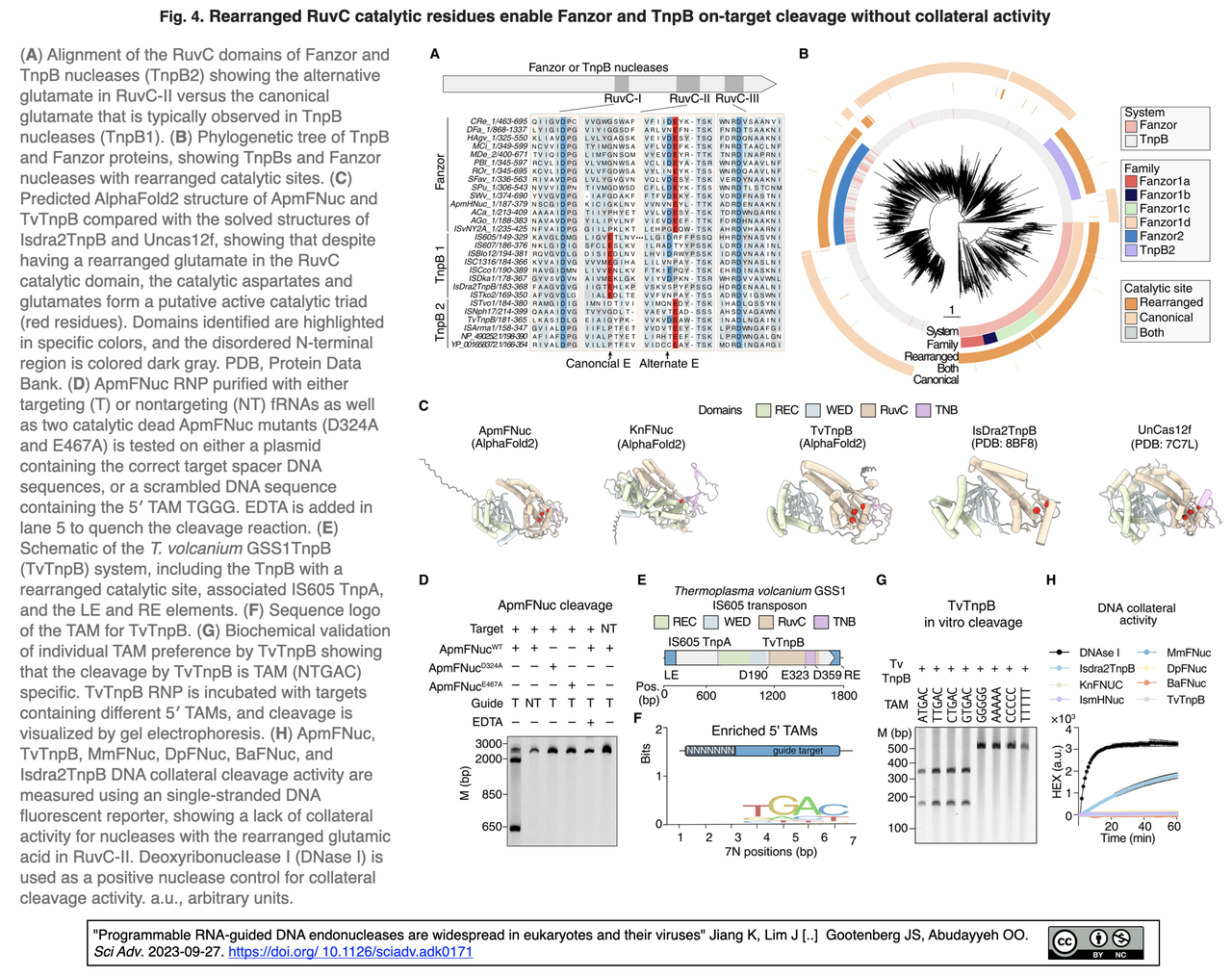[出典] "Programmable RNA-guided DNA endonucleases are widespread in eukaryotes and their viruses" Jiang K, Lim J [..] Gootenberg JS, Abudayyeh OO. Sci Adv. 2023-09-27. https://doi.org/10.1126/sciadv.adk0171 [著者所属] McGovern Institute for Brain Research/MIT, MIT, NCBI/NIH, 東大/東京医科歯科大 (bioRxiv 投稿の共著者には見られなかった加藤一希博士が構造解析支援と構造図作成で貢献)