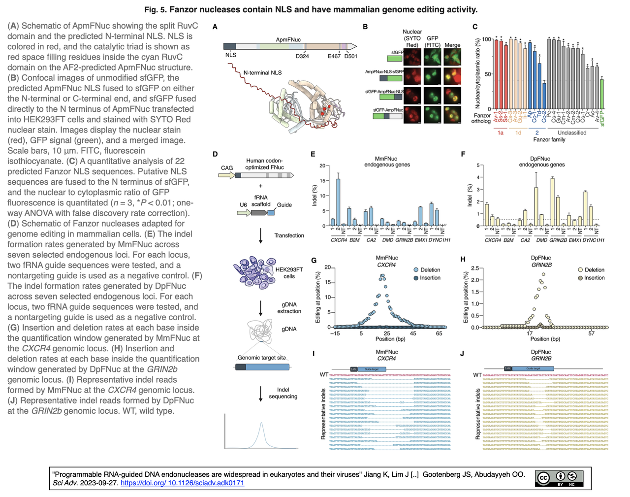 ヒト細胞において検出可能な切断活性およびインデル生成活性を有する効率的なゲノム編集に応用できることも実証した [Fig. 5引用左図参照]。Fanzorヌクレアーゼはコンパクト (~600 aa)であるため送達が容易であり、真核生物由来であることから、ヒトにおけるこれらのヌクレアーゼの免疫原性を緩和することも期待できる。しかし、Cas12fのような他の小型RNAガイドヌクレアーゼで達成されているように、ヒト細胞における活性をさらに改善する必要はある。 Fanzorヌクレアーゼが多様な真核生物の系統や関連ウイルスに広く分布していることから、真核生物にはさらに多くの現在未知のRNAガイドシステムが存在する可能性があり、将来の特性解析や新しいバイオテクノロジーの開発のための豊富な資源となることが示唆される。
