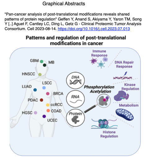 Geffen Y, Anand S, Akiyama Y, Yaron TM, Song Y [..] Aguet F, Cantley LC, Ding L, Getz G・Clinical Proteomic Tumor Analysis Consortium. Cell 2023-08-14. https://doi.org/10.1016/j.cell.2023.07.013;グラフィカルアブストラクト引用右図参照- NCIのCPTACから10種を含む11の癌種にわたる翻訳後修飾 (PTM) プロファイルを持つ患者1,110人のプロテオゲノミクスデータの最大コレクションを解析した。
