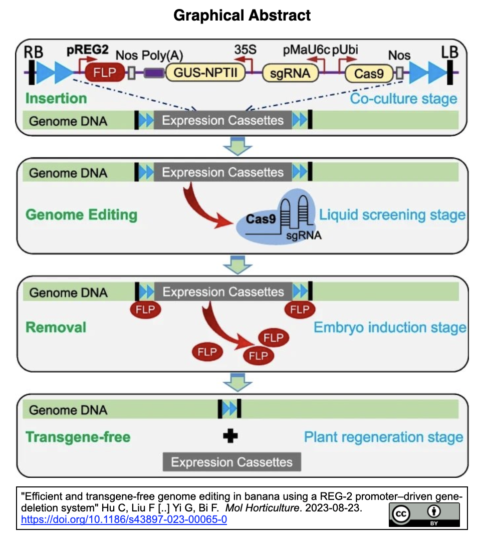 [出典] "Efficient and transgene-free genome editing in banana using a REG-2 promoter–driven gene-deletion system" Hu C, Liu F [..] Yi G, Bi F. Mol Horticulture. 2023-08-23. https://doi.org/10.1186/s43897-023-00065-0 [著者所属] Institute of Fruit Tree Research (広州), South China Agricultural U, Guangdong Laboratory for Lingnan Modern Agriculture;グラフィカルアブストラクト引用右下図参照