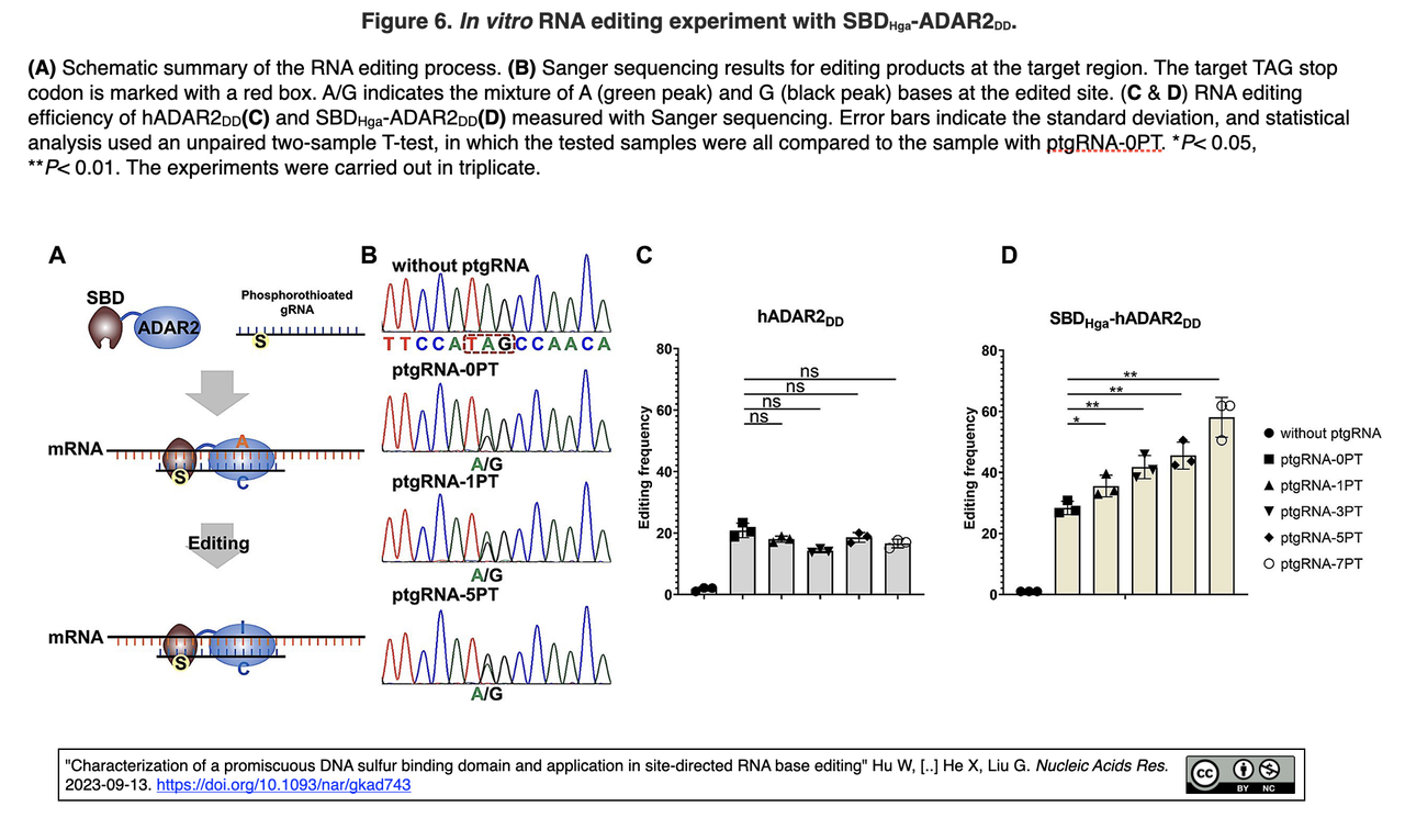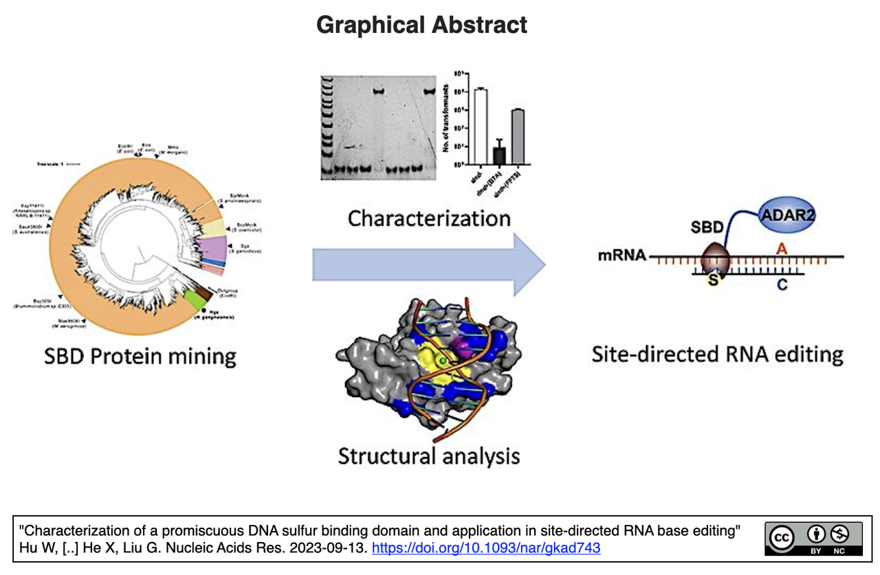 [出典] "Characterization of a promiscuous DNA sulfur binding domain and application in site-directed RNA base editing" Hu W, Yang B, Xiao Q [..] He X, Liu G. Nucleic Acids Res. 2023-09-13. https://doi.org/10.1093/nar/gkad743 [著者所属] Shanghai Jiao Tong U, Shanghai Advanced Research Institute CAS, East China U Science and Technology (ECUST)